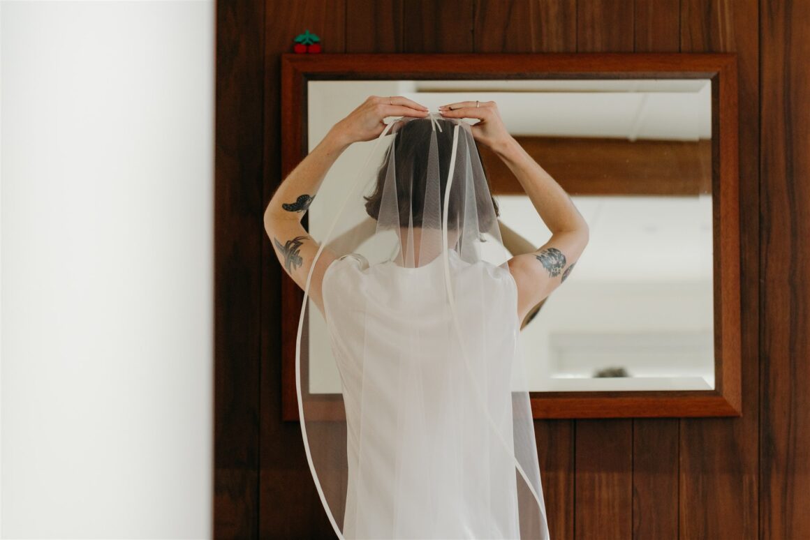 « Trouver une robe était vraiment un défi ! Nous avons pris l'avion pour Melbourne pendant un week-end spécifiquement pour trouver des tenues, mais aucun de nous n'a eu de chance. . . Ensuite, nous avons eu recours à des achats en ligne, ce qui était vraiment angoissant car nous avions peu de marge d'erreur car notre mariage avait lieu dans moins de deux semaines. Ma première vision comprenait des collants bleu poudré, une robe blanche courte et des nœuds bleu clair pour mes cheveux. Cependant, en mettant tout cela ensemble, j'avais l'impression d'avoir à nouveau 16 ans (pas dans le bon sens du terme). Donc quelques jours auparavant, j'ai (encore) regardé chez des créateurs basés à Melbourne et, heureusement, j'ai trouvé une robe Arnsdorf. Ma mère (qui vit à Melbourne) a acheté la robe et l'a emmenée avec elle quand elle et mon père sont arrivés la veille du mariage. Je suis tombée amoureuse lorsque je l'ai essayée dans leur chambre d'hôtel.