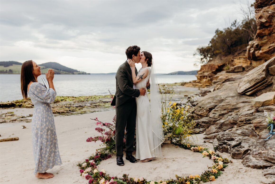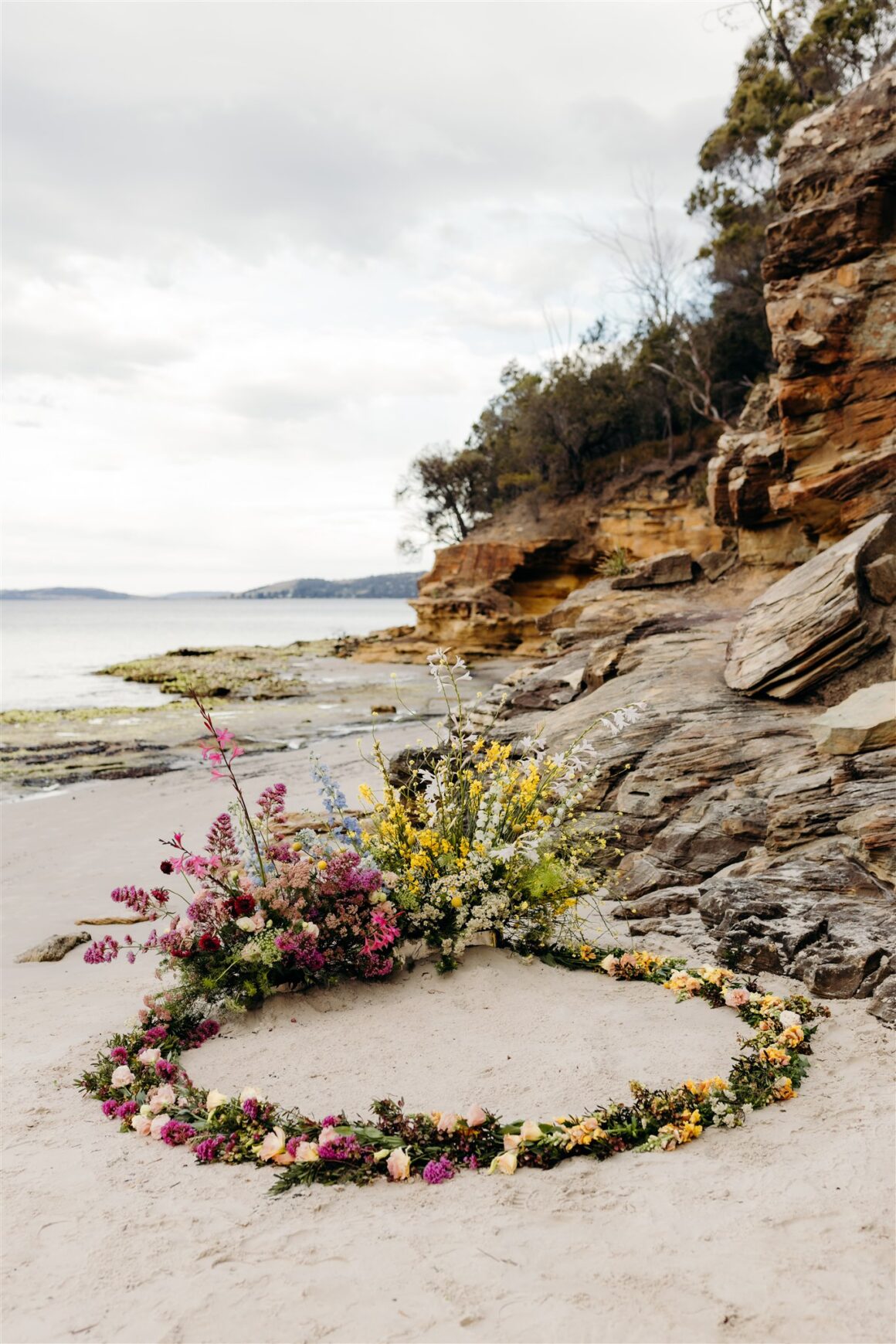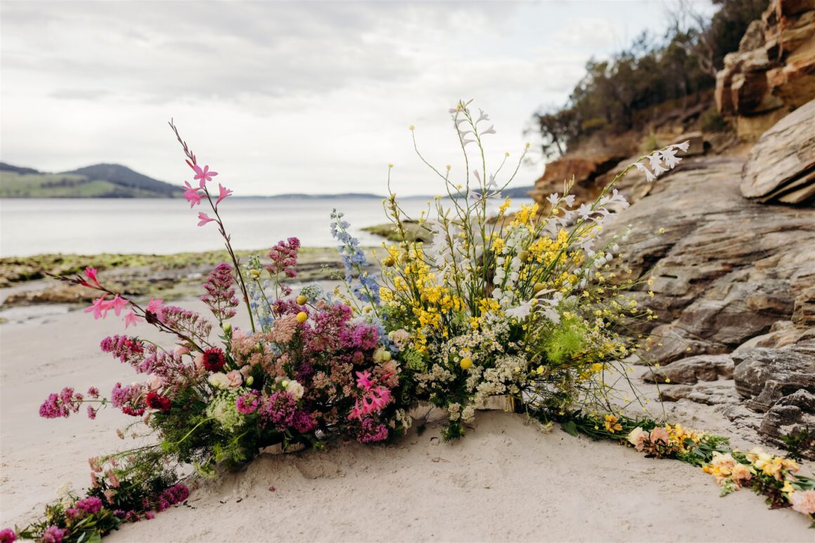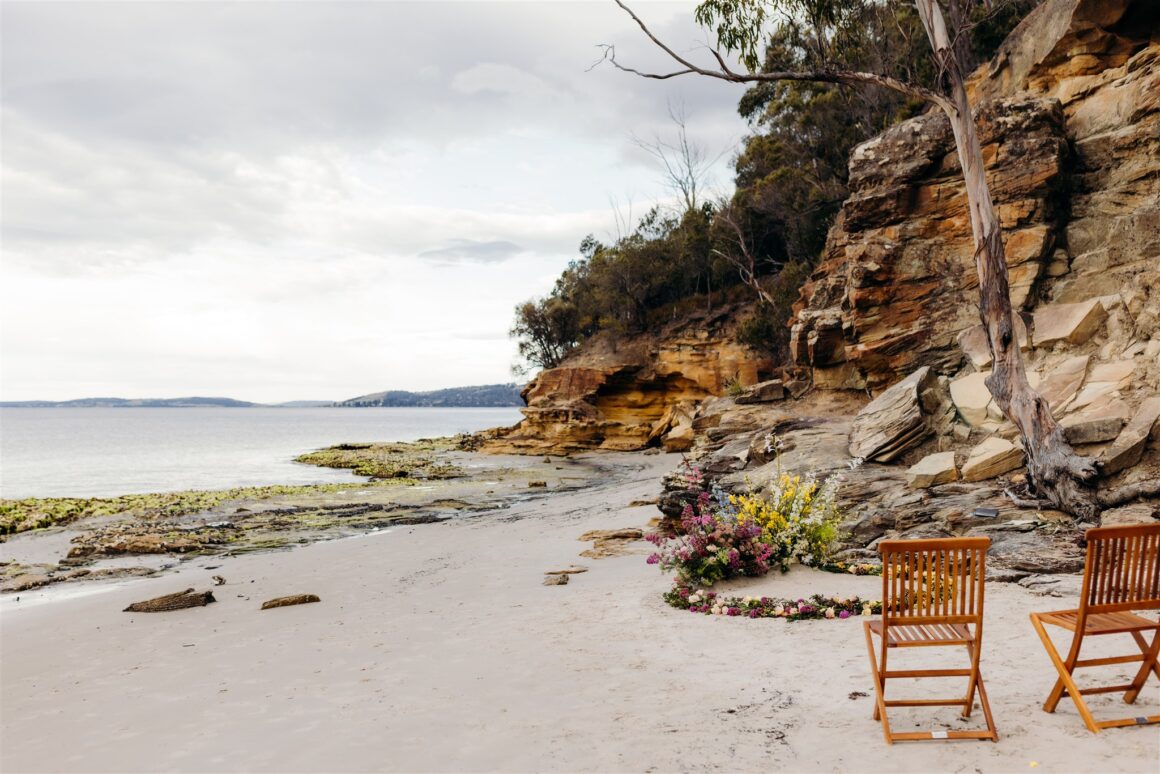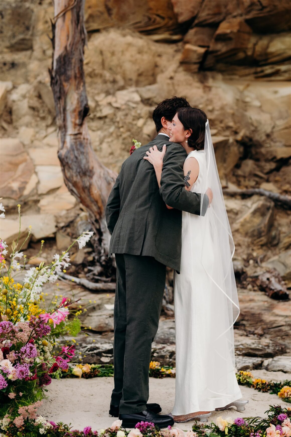 Ils n’ont pas eu besoin de chercher bien loin pour trouver le lieu idéal pour leur fugue intime. Coningham Beach, à Hobart, à seulement quelques centaines de mètres de chez moi, était l'endroit idéal. « C'est tellement magique et cela occupe une place spéciale dans nos cœurs. » Le couple rapporte que le bouche à oreille a été la clé pour trouver leur équipe de rêve, leur célébrant, Merren Wilkinson (Cinta Celebrate Love), étant celui qui a recommandé leur photographe, Jess Oakenfull. « Nous avons adoré l'approche franche de Jess et sa capacité à capturer les instants intermédiaires sans que nous soyons conscients de sa présence. »