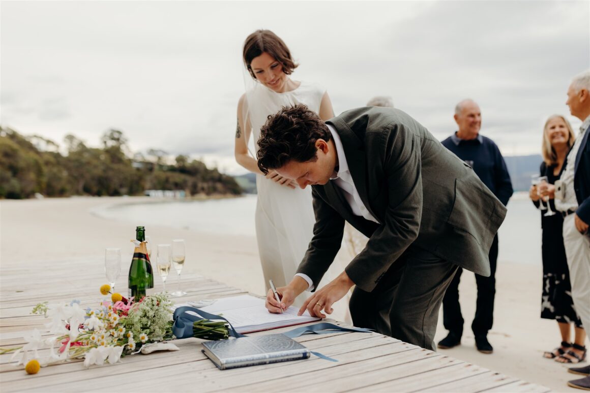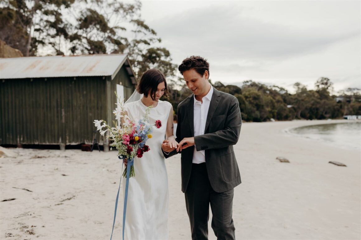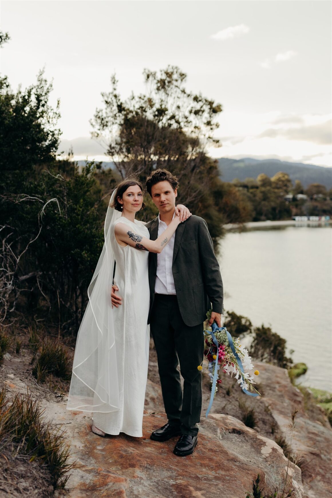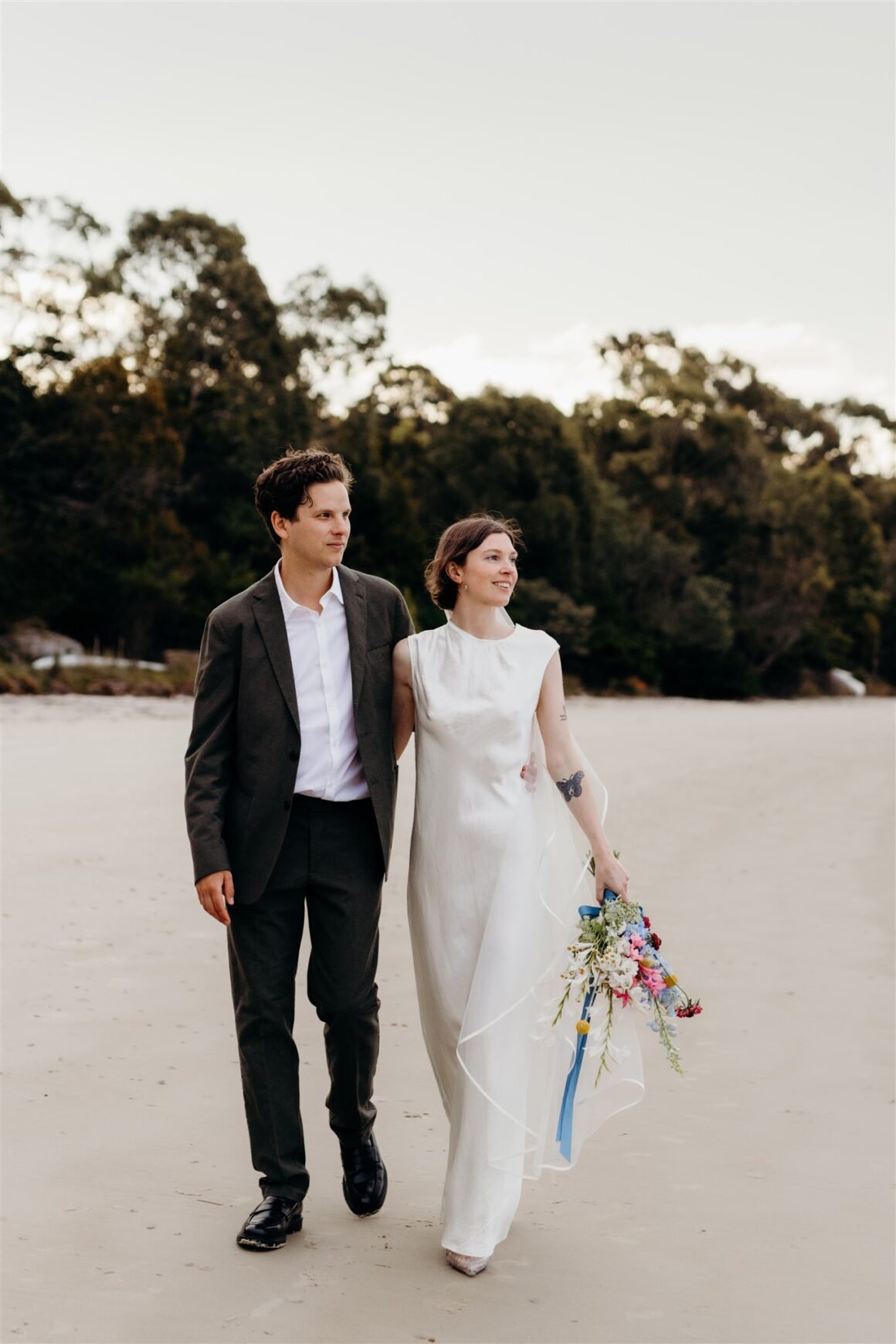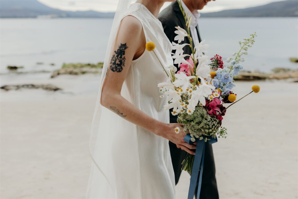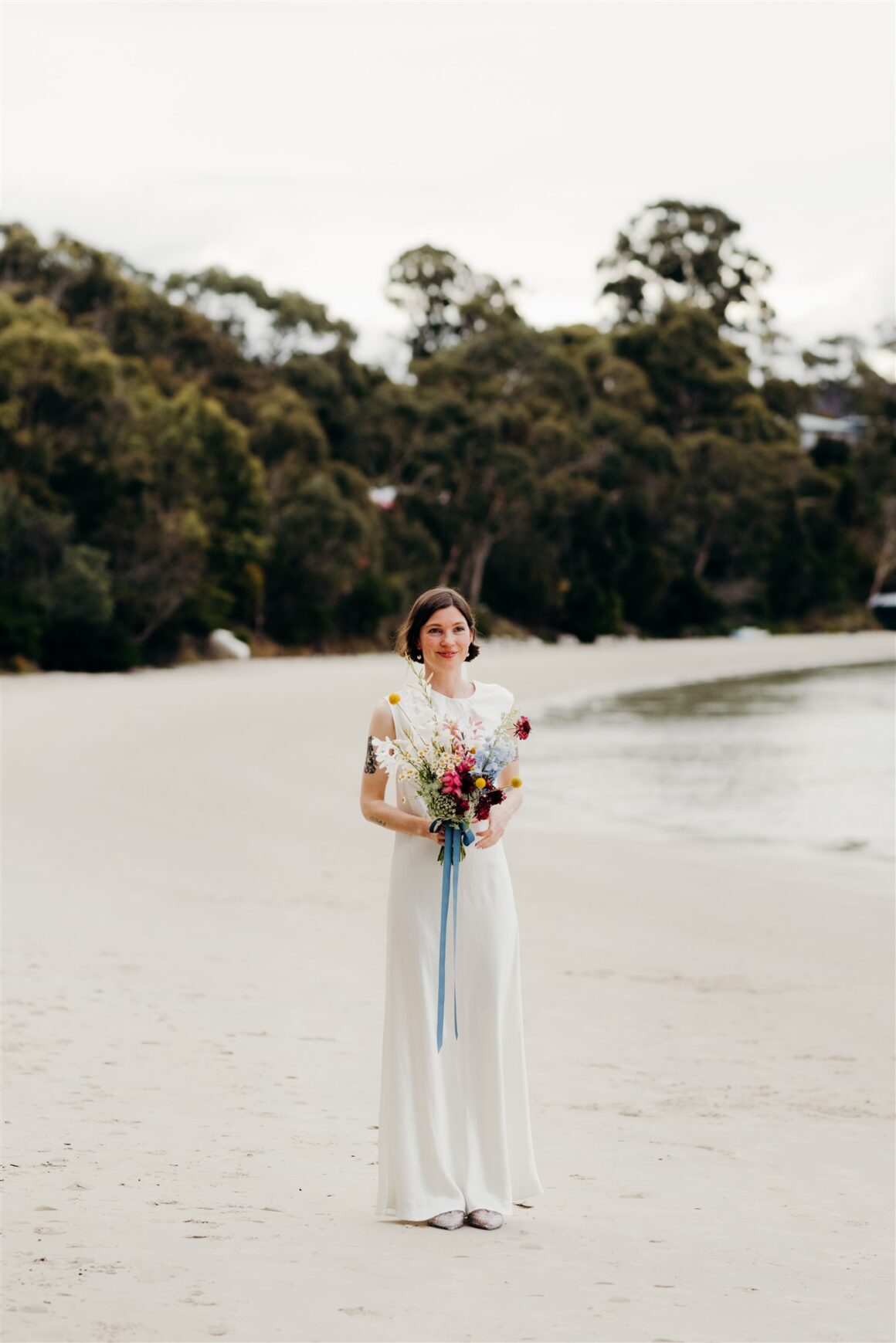 Ils n’ont pas eu besoin de chercher bien loin pour trouver le lieu idéal pour leur fugue intime. Coningham Beach, à Hobart, à seulement quelques centaines de mètres de chez moi, était l'endroit idéal. « C'est tellement magique et cela occupe une place spéciale dans nos cœurs. » Le couple rapporte que le bouche à oreille a été la clé pour trouver leur équipe de rêve, leur célébrant, Merren Wilkinson (Cinta Celebrate Love), étant celui qui a recommandé leur photographe, Jess Oakenfull. « Nous avons adoré l'approche franche de Jess et sa capacité à capturer les instants intermédiaires sans que nous soyons conscients de sa présence. »