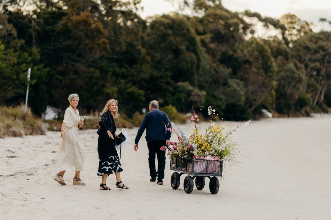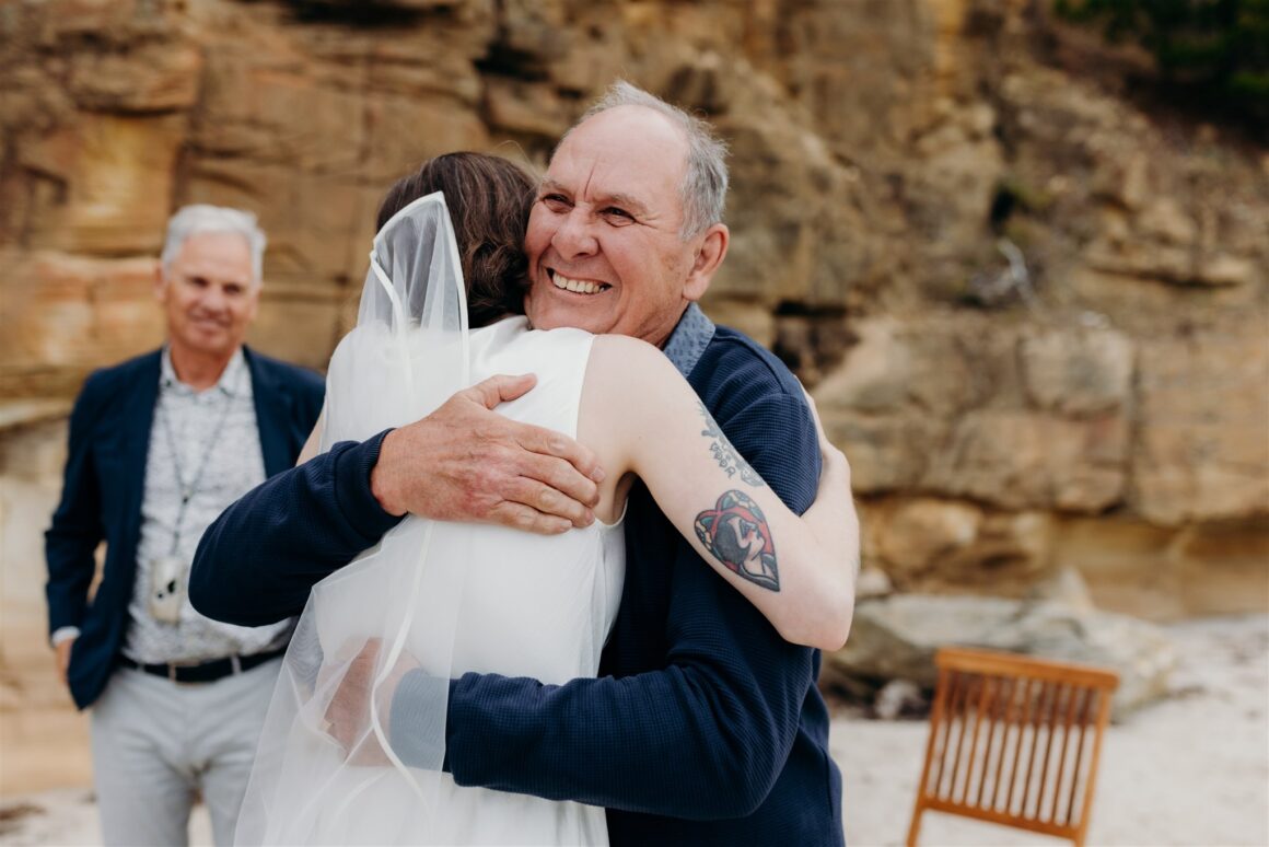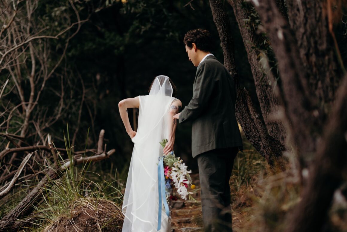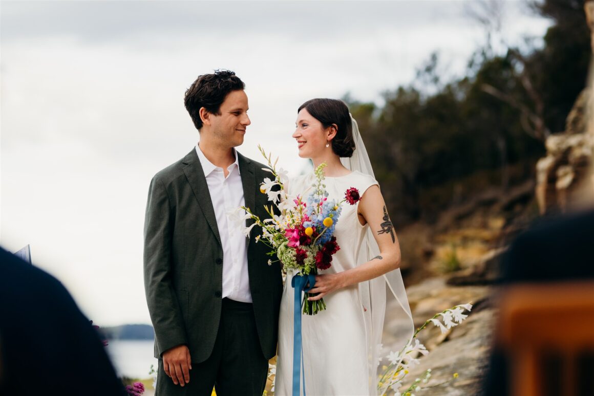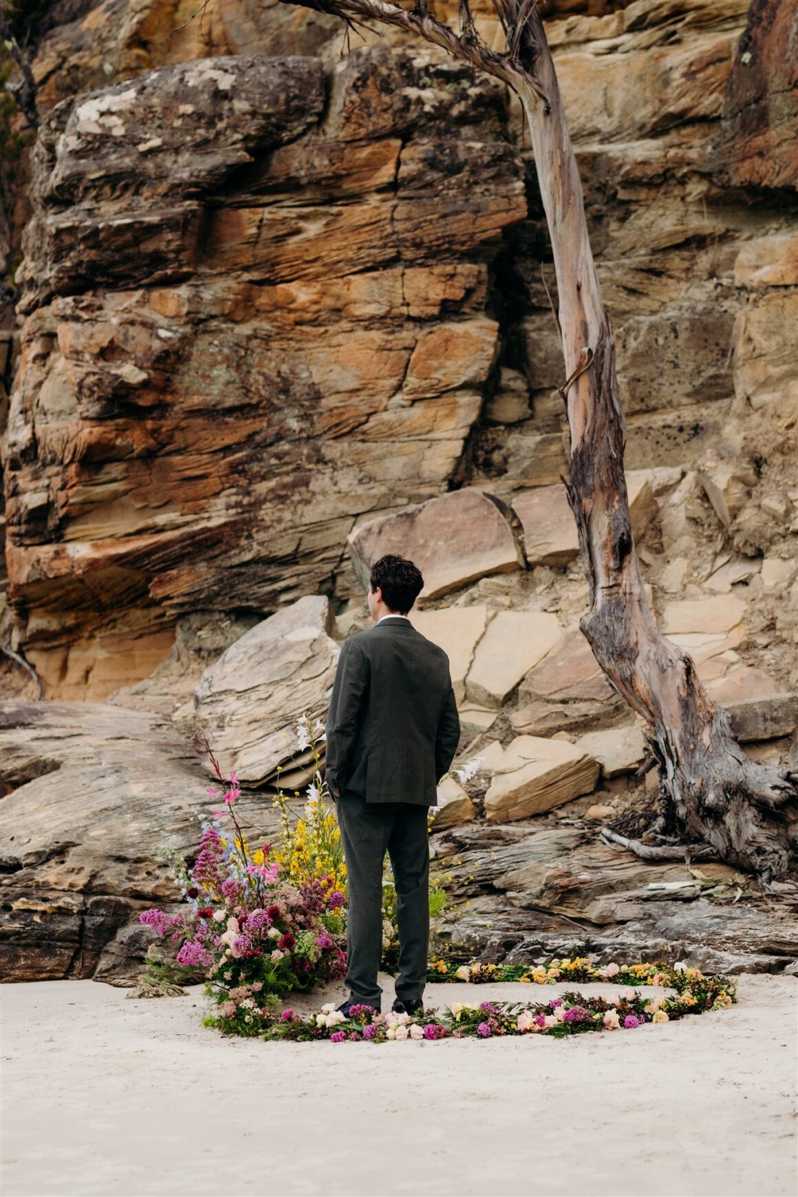 Ils n’ont pas eu besoin de chercher bien loin pour trouver le lieu idéal pour leur fugue intime. Coningham Beach, à Hobart, à seulement quelques centaines de mètres de chez moi, était l'endroit idéal. « C'est tellement magique et cela occupe une place spéciale dans nos cœurs. » Le couple rapporte que le bouche à oreille a été la clé pour trouver leur équipe de rêve, leur célébrant, Merren Wilkinson (Cinta Celebrate Love), étant celui qui a recommandé leur photographe, Jess Oakenfull. « Nous avons adoré l'approche franche de Jess et sa capacité à capturer les instants intermédiaires sans que nous soyons conscients de sa présence. »