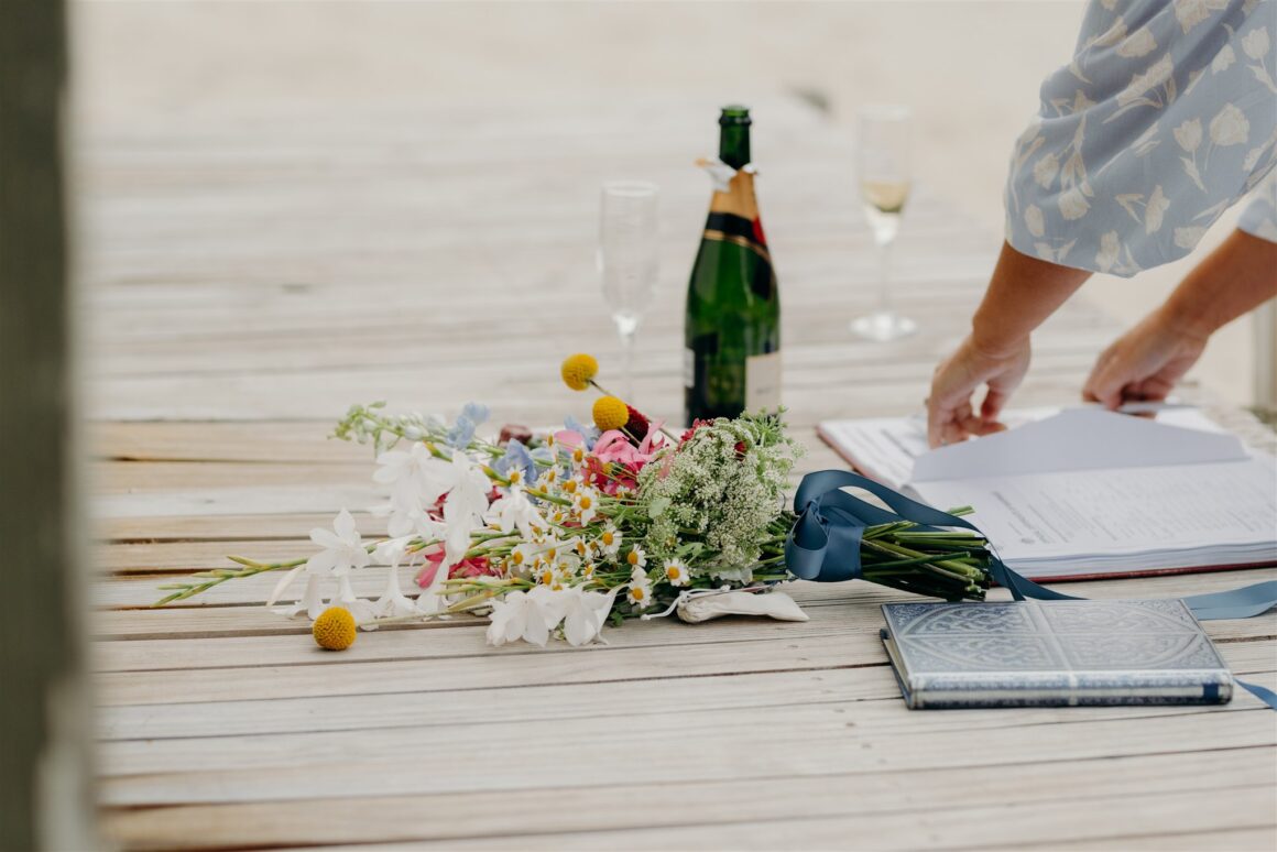 Le grand jour, ils avaient la plage pour eux seuls avec leurs quatre invités. Ils l'ont rendu officiel, entourés de fleurs aux tons naturels de l'océan, arborant tous deux des tenues incroyables qu'ils n'avaient trouvées que quelques jours auparavant (!!) Plus à ce sujet, et d'autres éléments magiques, ci-dessous…