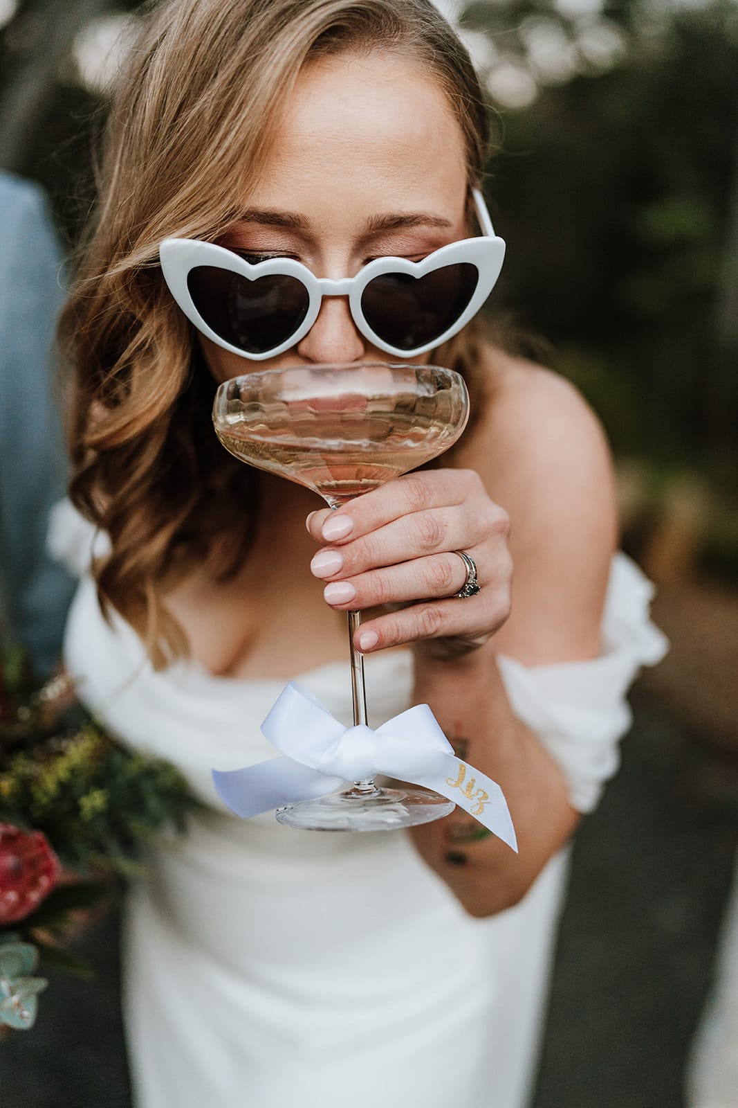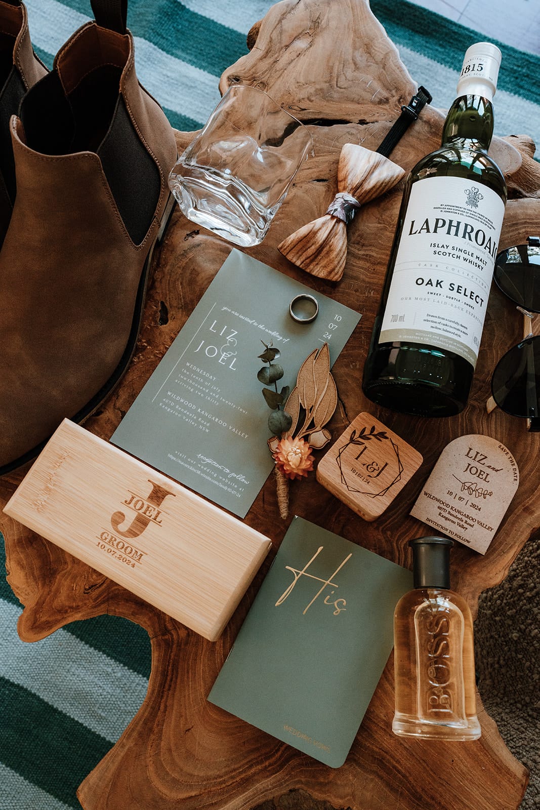 Détails préférés «Plutôt que d'acheter des bijoux, je voulais porter les boucles d'oreilles en fleur de cerisier coupées au laser que Joel avait fait à la main pour moi il y a de nombreuses années. Ceux-ci s'inscrivent également dans notre esthétique naturelle du bois et des légumes verts. Pour Joel, j'ai fait à la main ses trous de bouton après [we designed them together]. Nous avons également conçu des colliers de fleurs pour deux de nos chats à l'aide de fleurs de soie. D'autres détails le jour où nous avons créé étaient notre gâteau, notre jeu de signature de lune de miel et le panneau de barre. Ces articles reflétaient nos amours partagés dans la vie, nos chats, nos voyages et les bons cocktails.