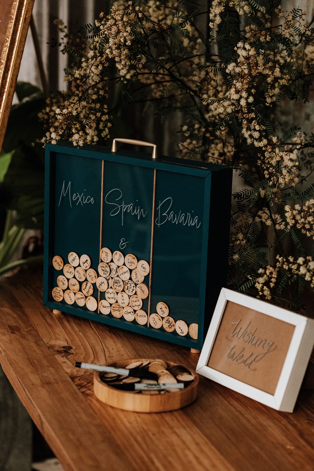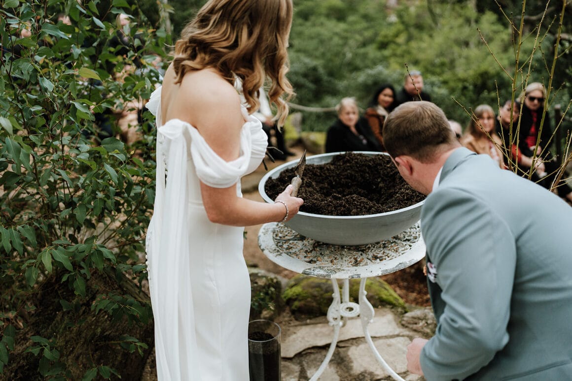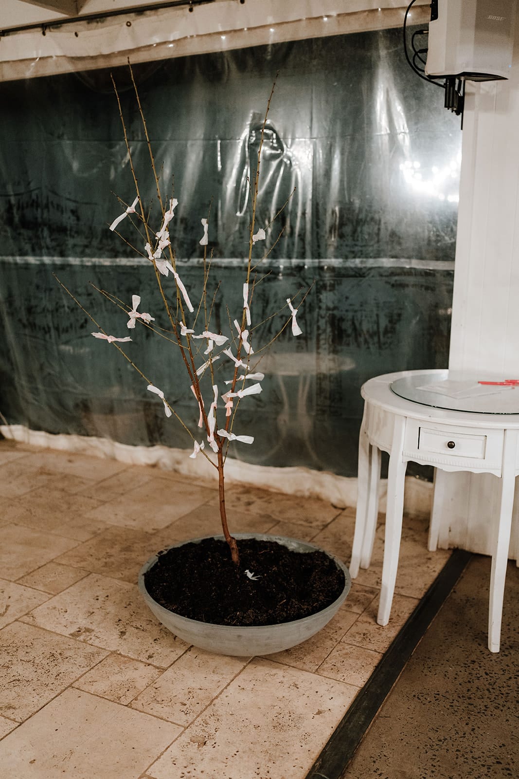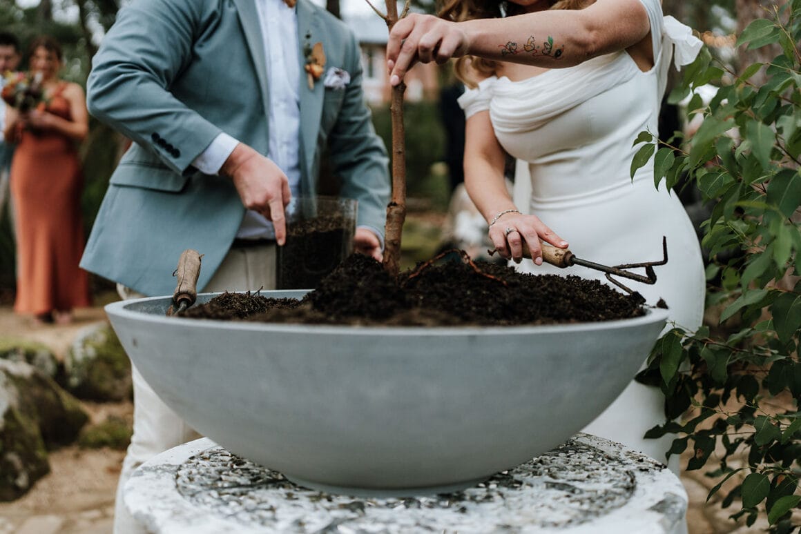 Fool Custom «Pour intégrer notre amour du Japon, nous avons planté une fleur de prune japonaise lors de notre cérémonie. Il y a une pratique japonaise où des vœux sont écrits sur des bandes de papier et attachés à une branche. Cette pratique découle d'un festival [that] célèbre deux amoureux des étoiles. Au cours de notre cérémonie, après avoir planté notre arbre, nous avons tous deux écrit un bon souhait et lié cela à notre arbre. Nous avons ensuite demandé à nos parents et à la fête de mariage d'écrire leurs propres souhaits et de le lier à l'arbre. Après la cérémonie, les invités restants pouvaient faire de même. »
