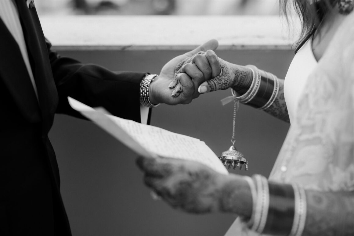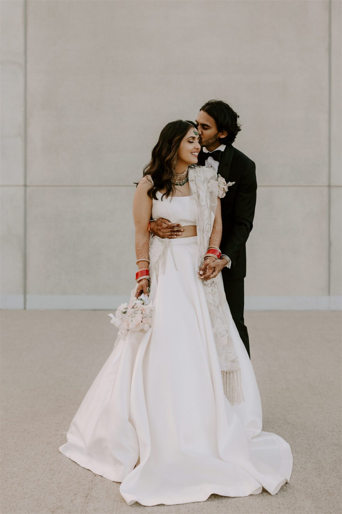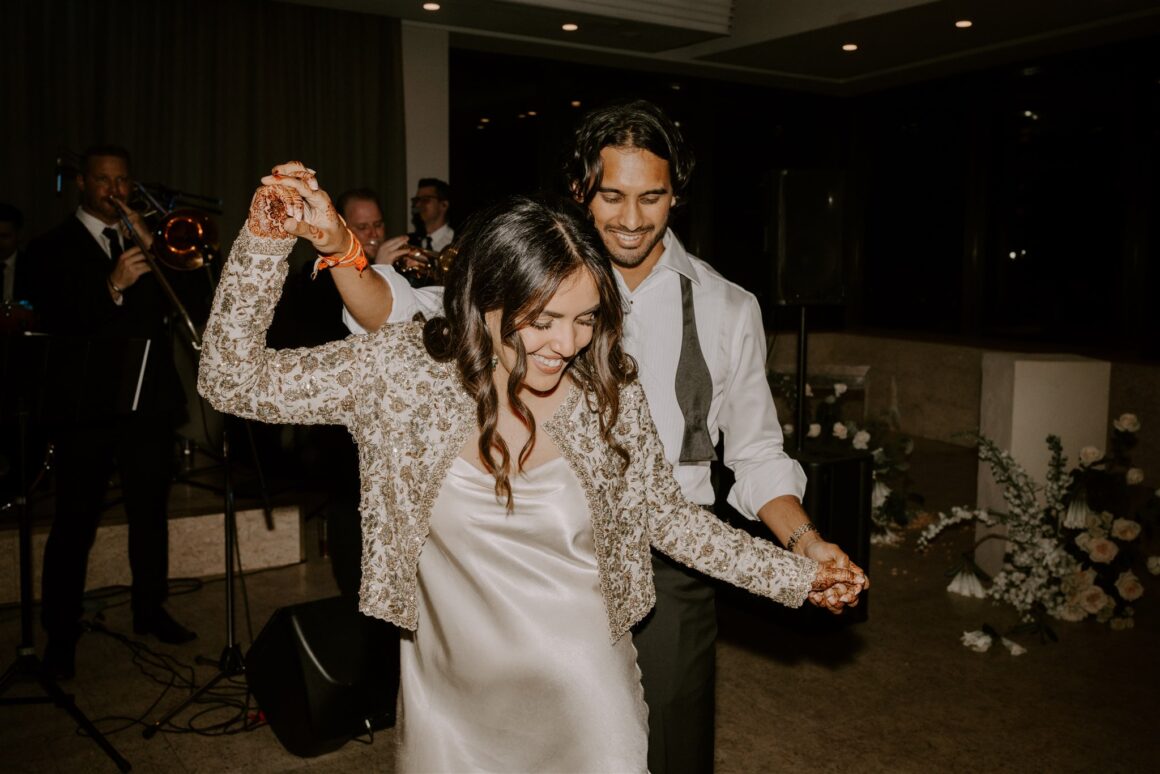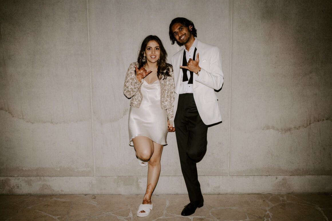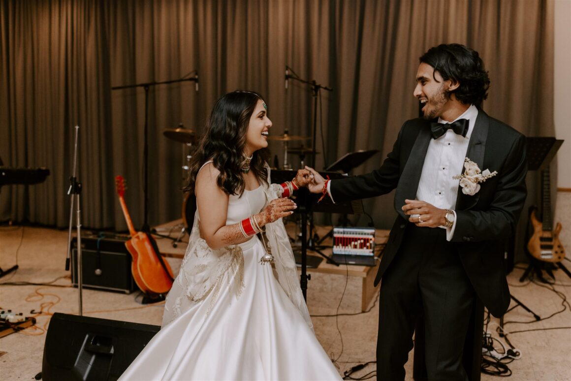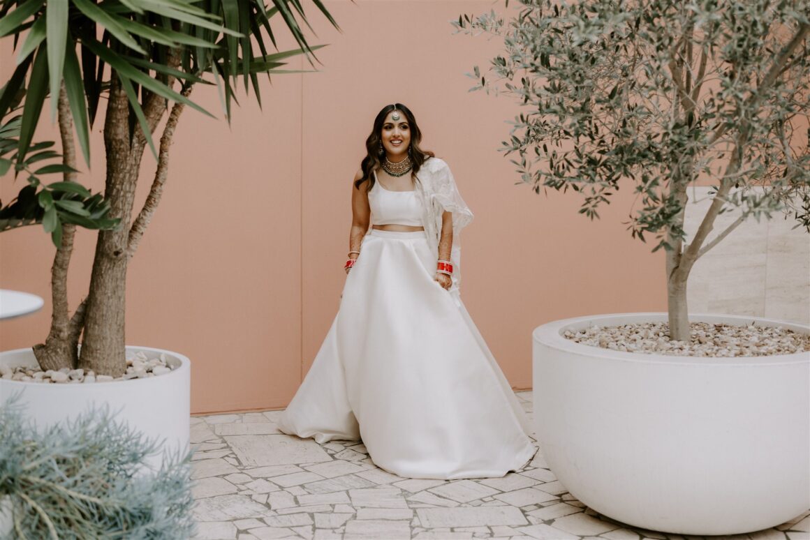 « Nous avons eu un premier regard environ une heure avant le début de la cérémonie. Nous étions seuls (avec notre photographe Janneke et le vidéaste Luke) pendant que nous nous lisions nos vœux. C'était agréable de partager des moments plus intimes et plus calmes ensemble avant. Le deuxième souvenir spécial était de nous asseoir pour faire la bénédiction hindoue, nous avons regardé dehors et avons vu une mer de nos personnes préférées – les mots ne peuvent pas décrire le bonheur que nous avons ressenti à ce moment-là. Nous avons vraiment eu de la chance d'avoir de la famille venue de diverses parties du monde pour nous célébrer. Dernier et surtout, Gihan, les garçons d'honneur, notre MC et mon frère ont préparé une danse pour me surprendre à la réception. Gihan a fait un mélange de toutes mes chansons et bobines Instagram préférées, et a incorporé beaucoup de mes propres mouvements de danse « cool » du jour ! »