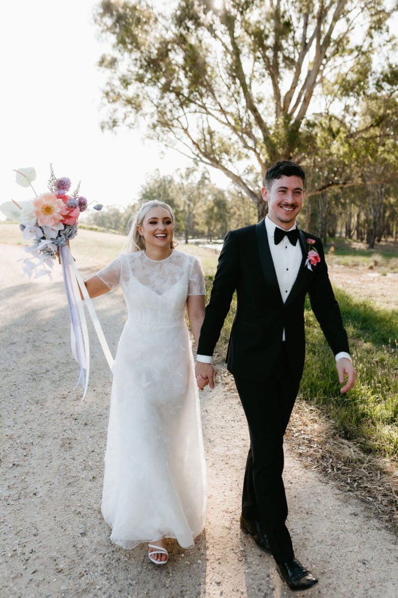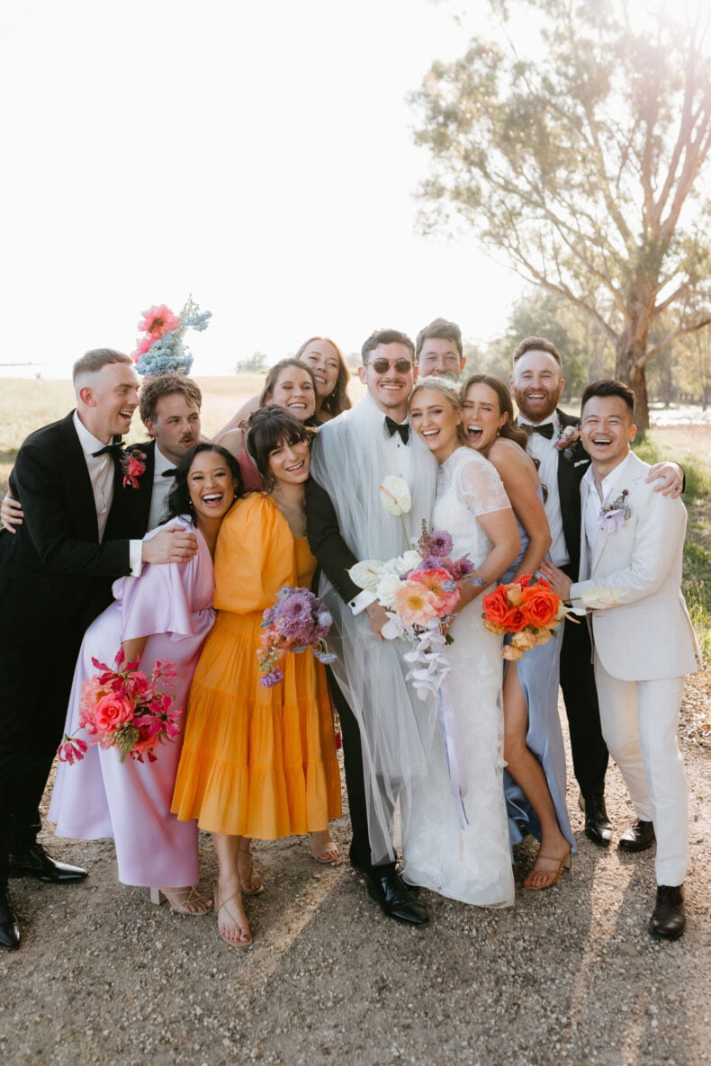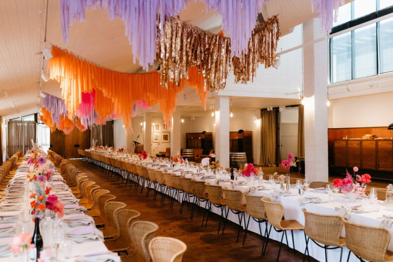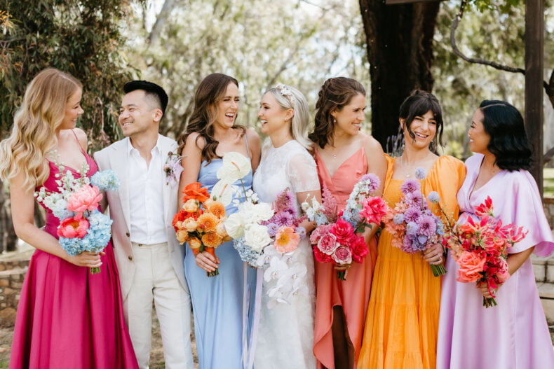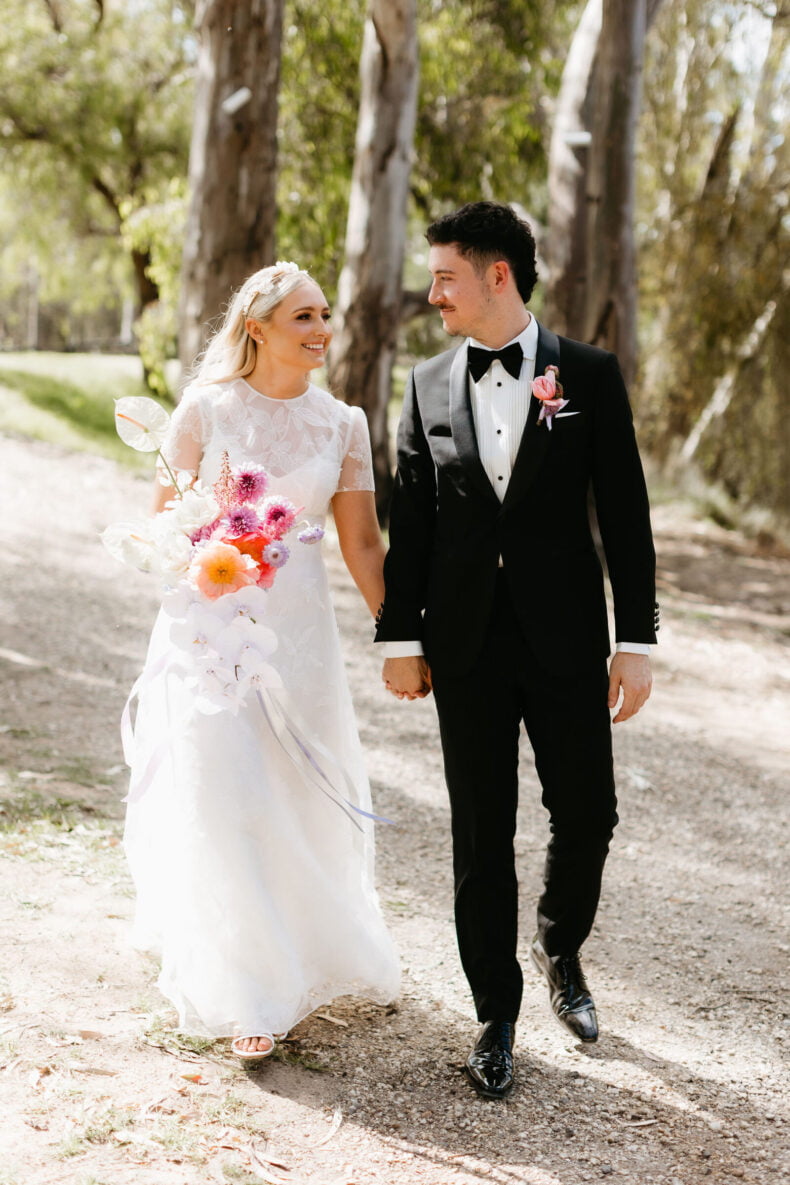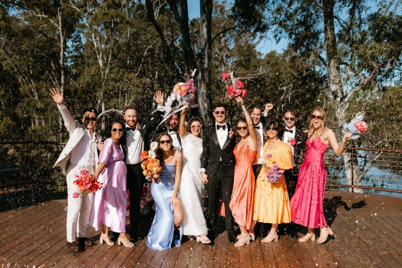 La couleur et la musique étaient au centre des préoccupations d’Annabel et Will lors de la planification de leur mariage à Mitchelton Winery à Nagambie, à une heure et demie de Melbourne. Ils avaient ces paroles de sagesse à partager : « Le son joue un rôle important dans le type d’ambiance que vous souhaitez créer. Choisissez judicieusement vos fournisseurs. Notre conseil ? La discothèque des années 70 est la meilleure entrée en matière pour faire la fête ! » Aimer!