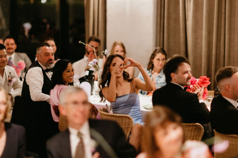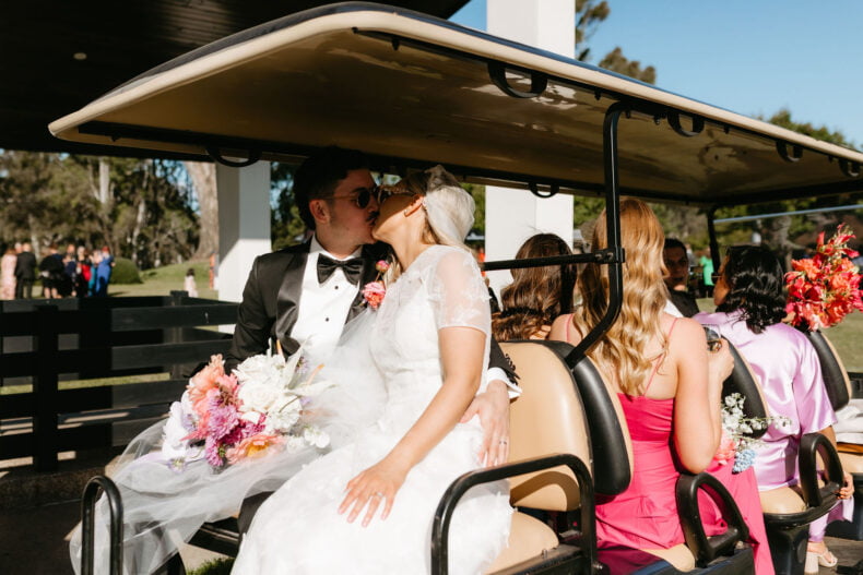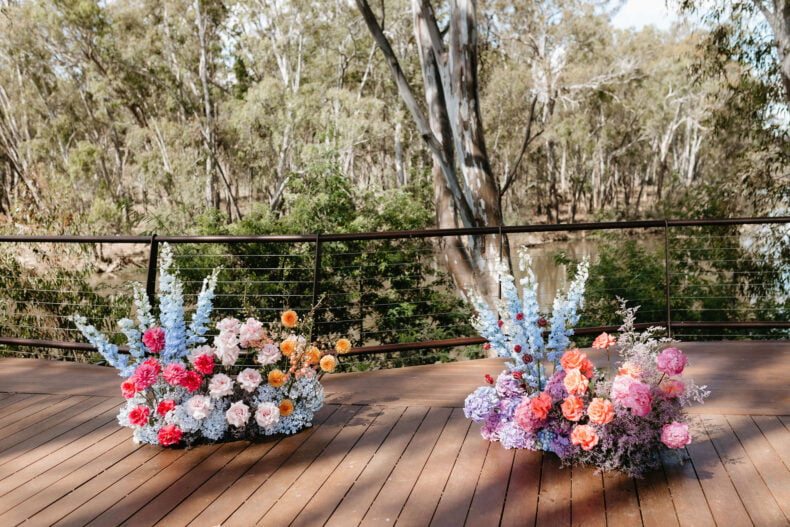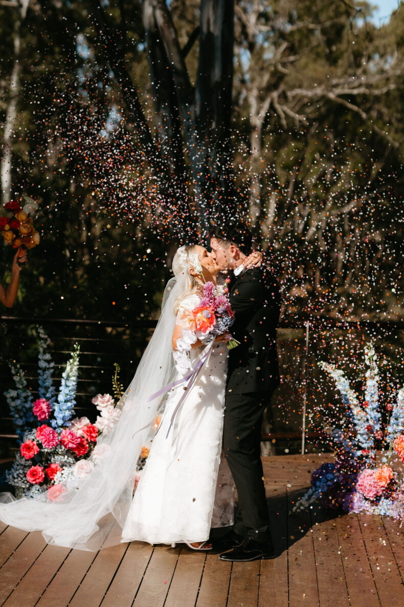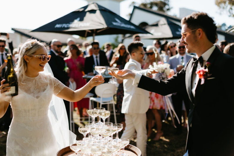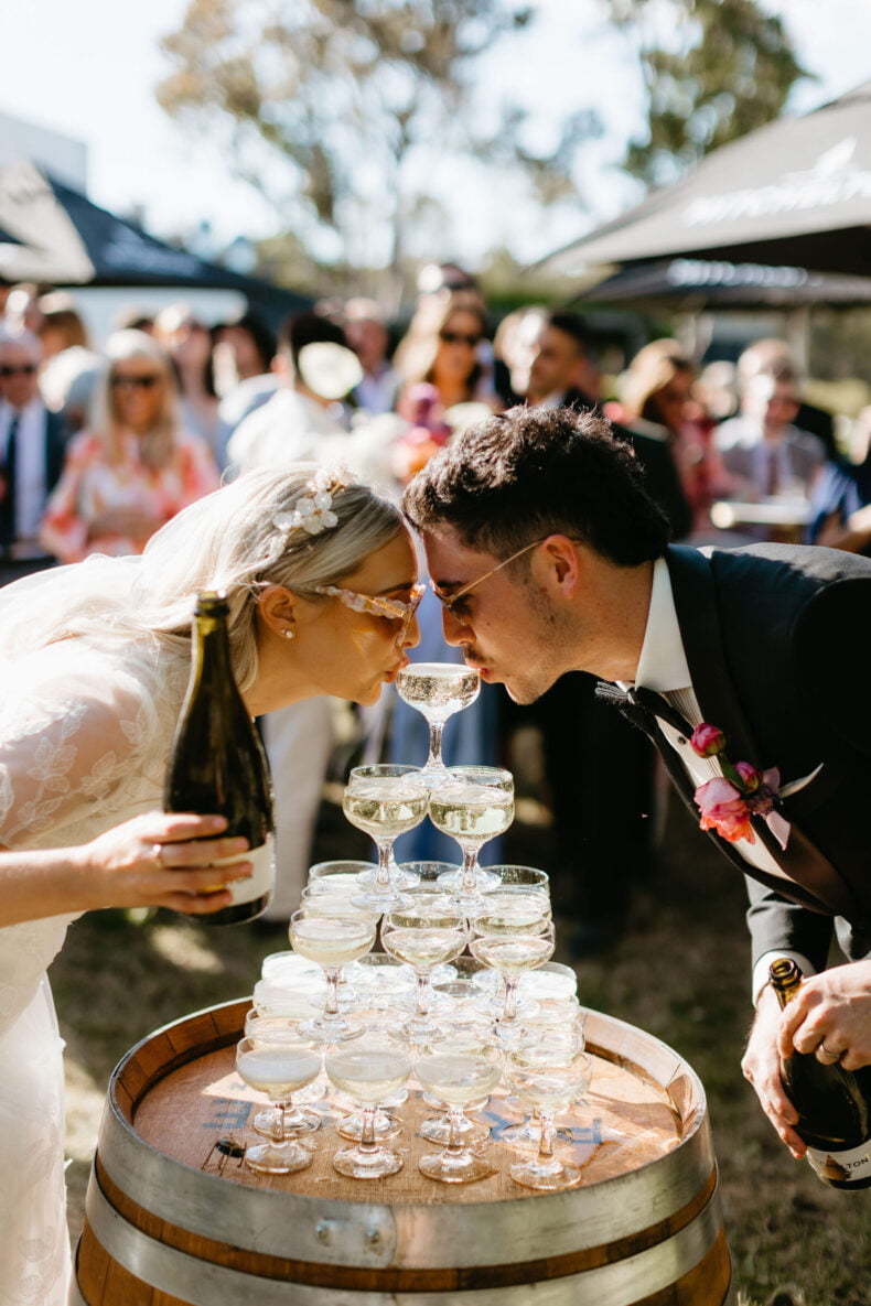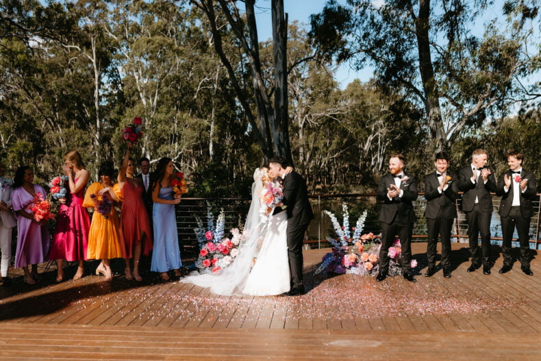 La couleur et la musique étaient au centre des préoccupations d’Annabel et Will lors de la planification de leur mariage à Mitchelton Winery à Nagambie, à une heure et demie de Melbourne. Ils avaient ces paroles de sagesse à partager : « Le son joue un rôle important dans le type d’ambiance que vous souhaitez créer. Choisissez judicieusement vos fournisseurs. Notre conseil ? La discothèque des années 70 est la meilleure entrée en matière pour faire la fête ! » Aimer!