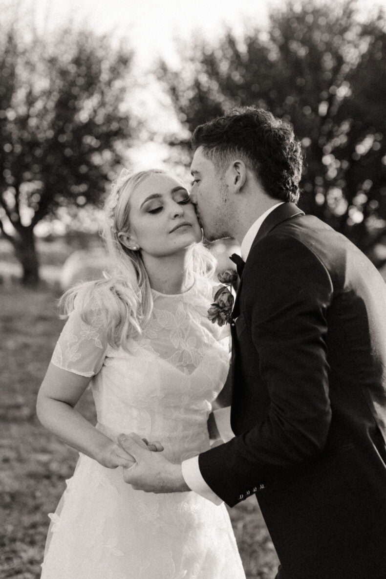 TOUCHE DE TRADITION « Nous avons demandé à la tante d’Annabel de faire une reconnaissance du pays pour commencer notre cérémonie. Comme notre mariage a eu lieu sur les rives de la rivière Goulburn, il était particulièrement important de reconnaître le peuple Taungurung, les propriétaires traditionnels, et le soin qu’ils ont apporté à la terre depuis des milliers d’années. Nous avons également eu une photo hommage à nos grands-parents, qui était visible par les invités dès leur entrée dans l’espace de réception. En présence d’Elva, la grand-parente maternelle d’Annabel, nous voulions rendre hommage à nos grands-parents qui n’avaient pas pu être avec nous ce jour-là.