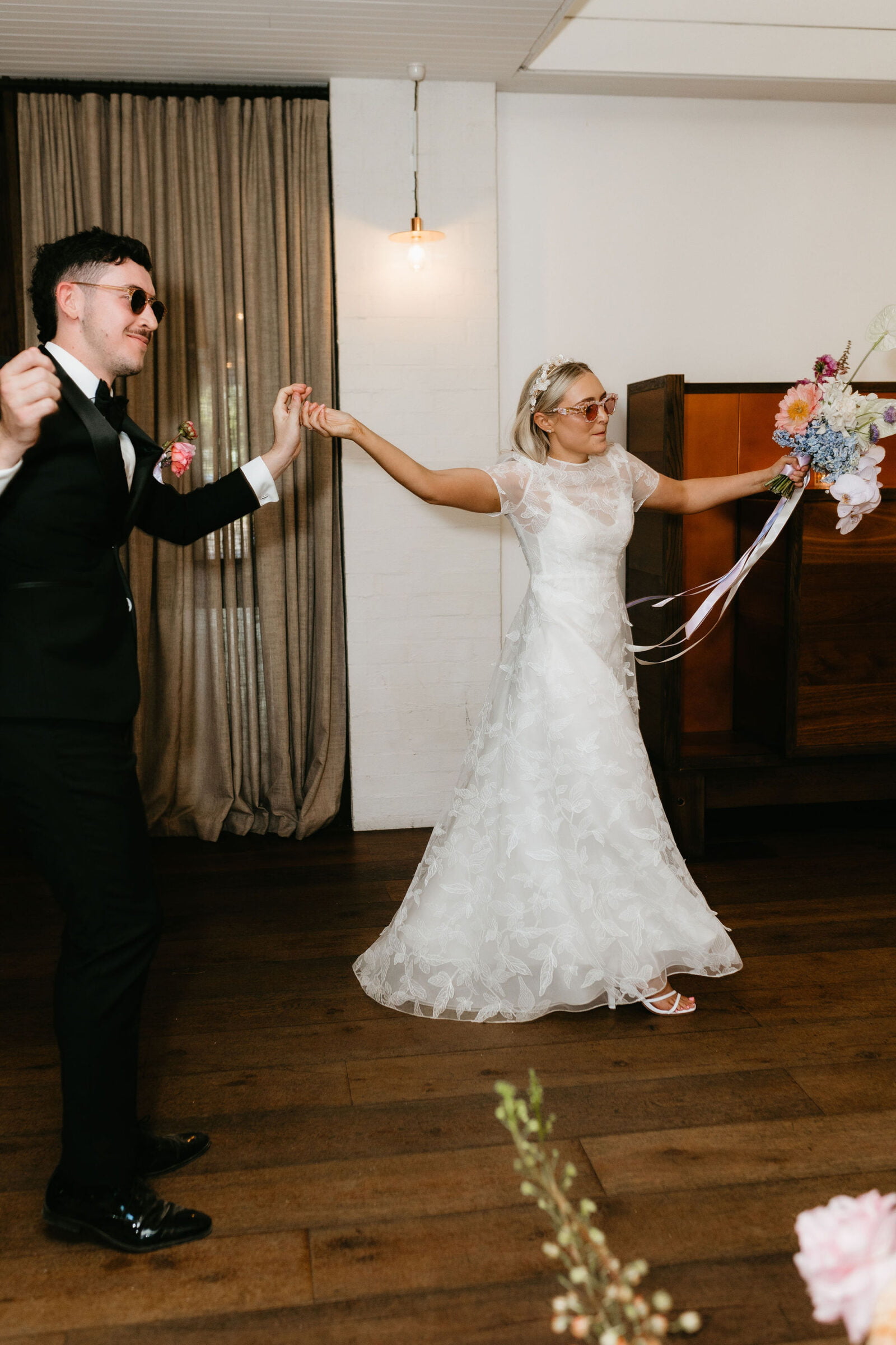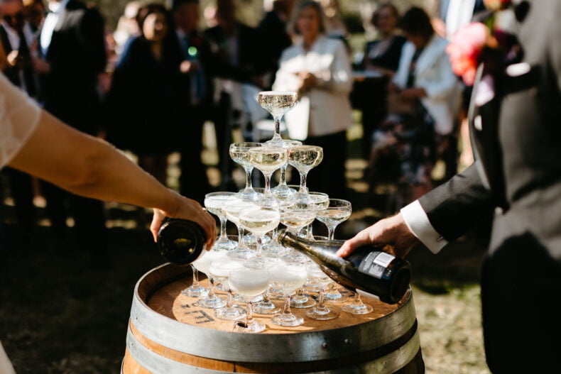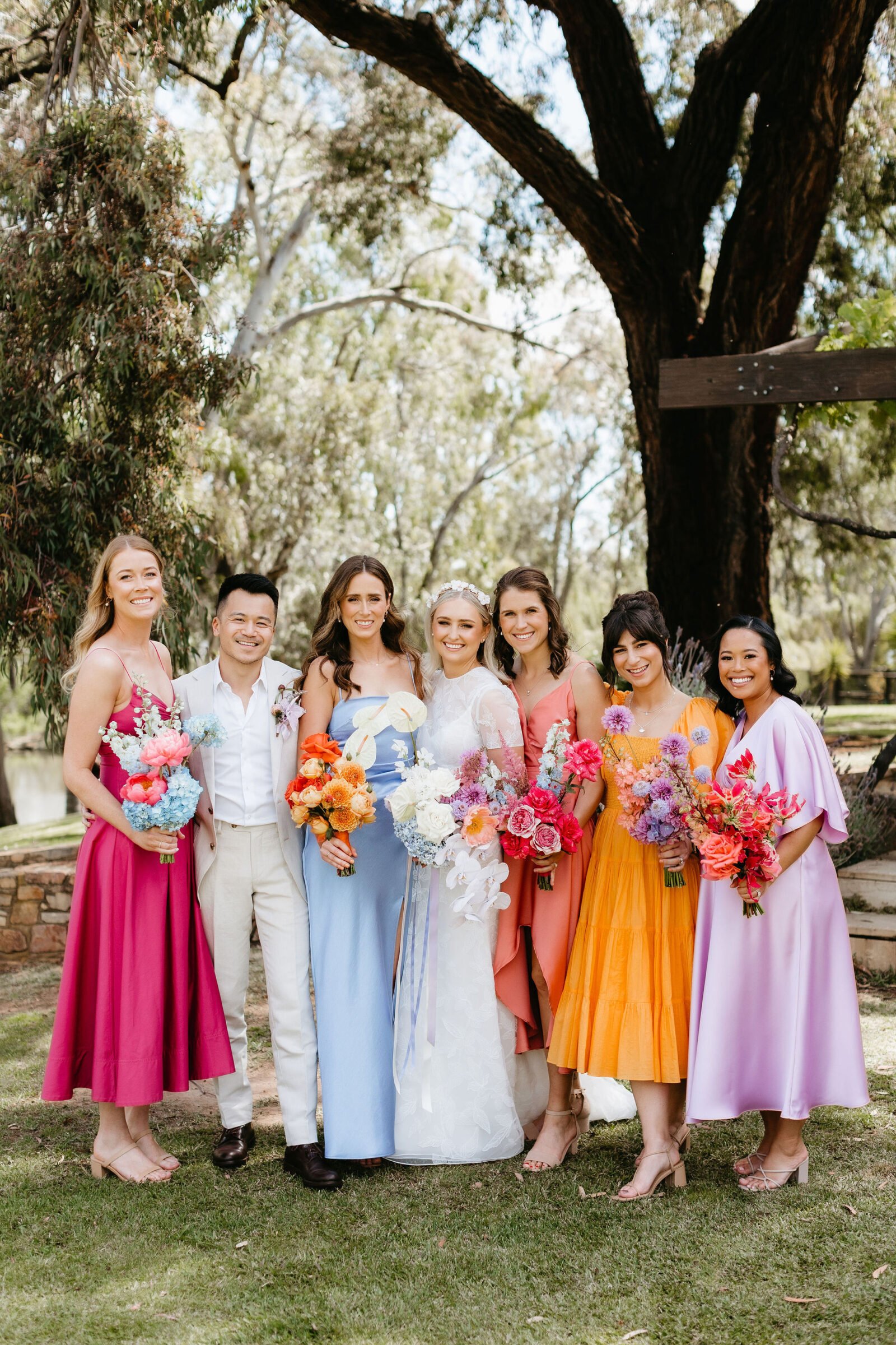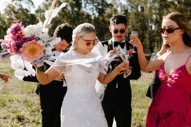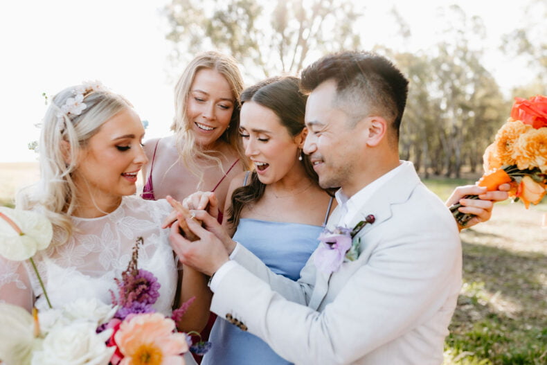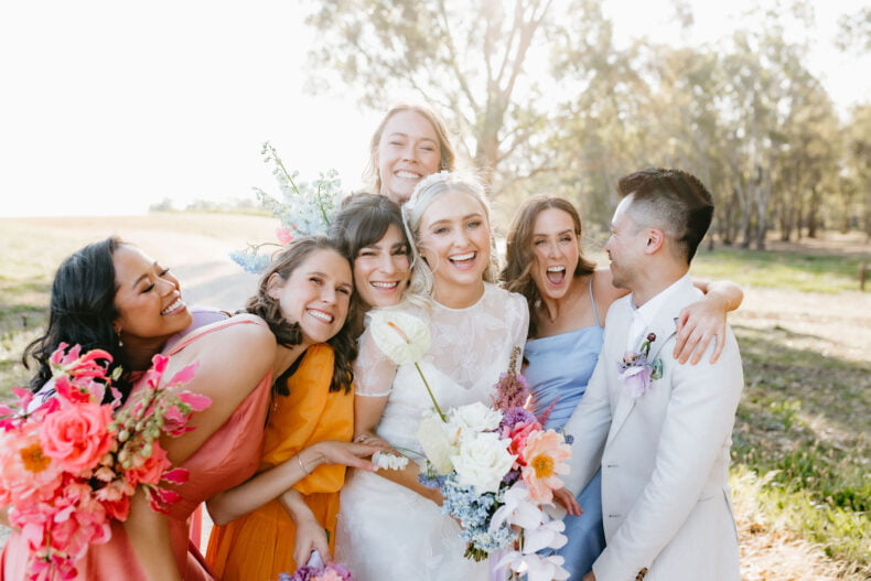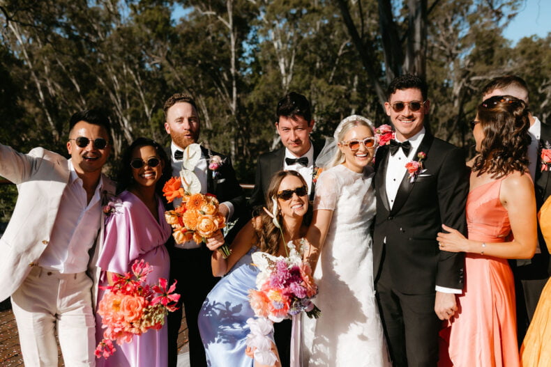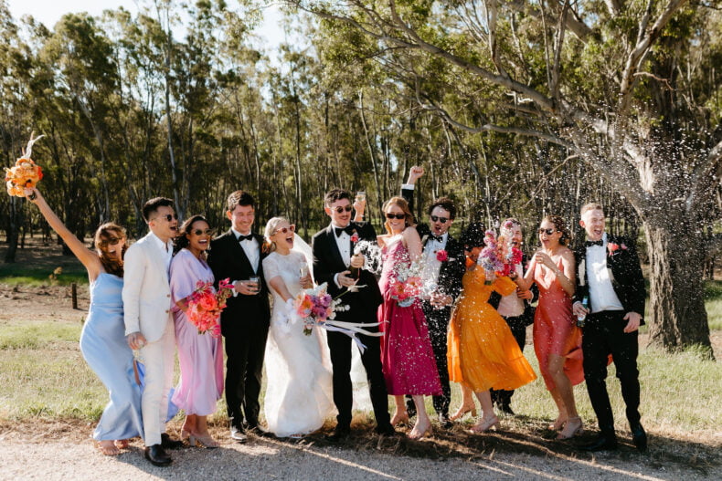La couleur et la musique étaient au centre des préoccupations d’Annabel et Will lors de la planification de leur mariage à Mitchelton Winery à Nagambie, à une heure et demie de Melbourne. Ils avaient ces paroles de sagesse à partager : « Le son joue un rôle important dans le type d’ambiance que vous souhaitez créer. Choisissez judicieusement vos fournisseurs. Notre conseil ? La discothèque des années 70 est la meilleure entrée en matière pour faire la fête ! » Aimer!