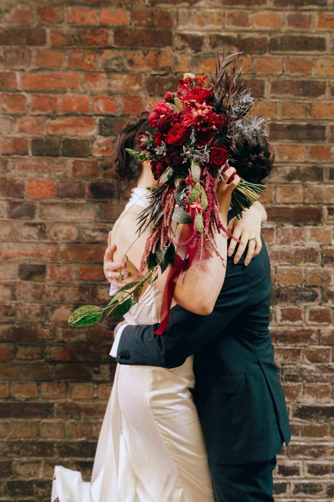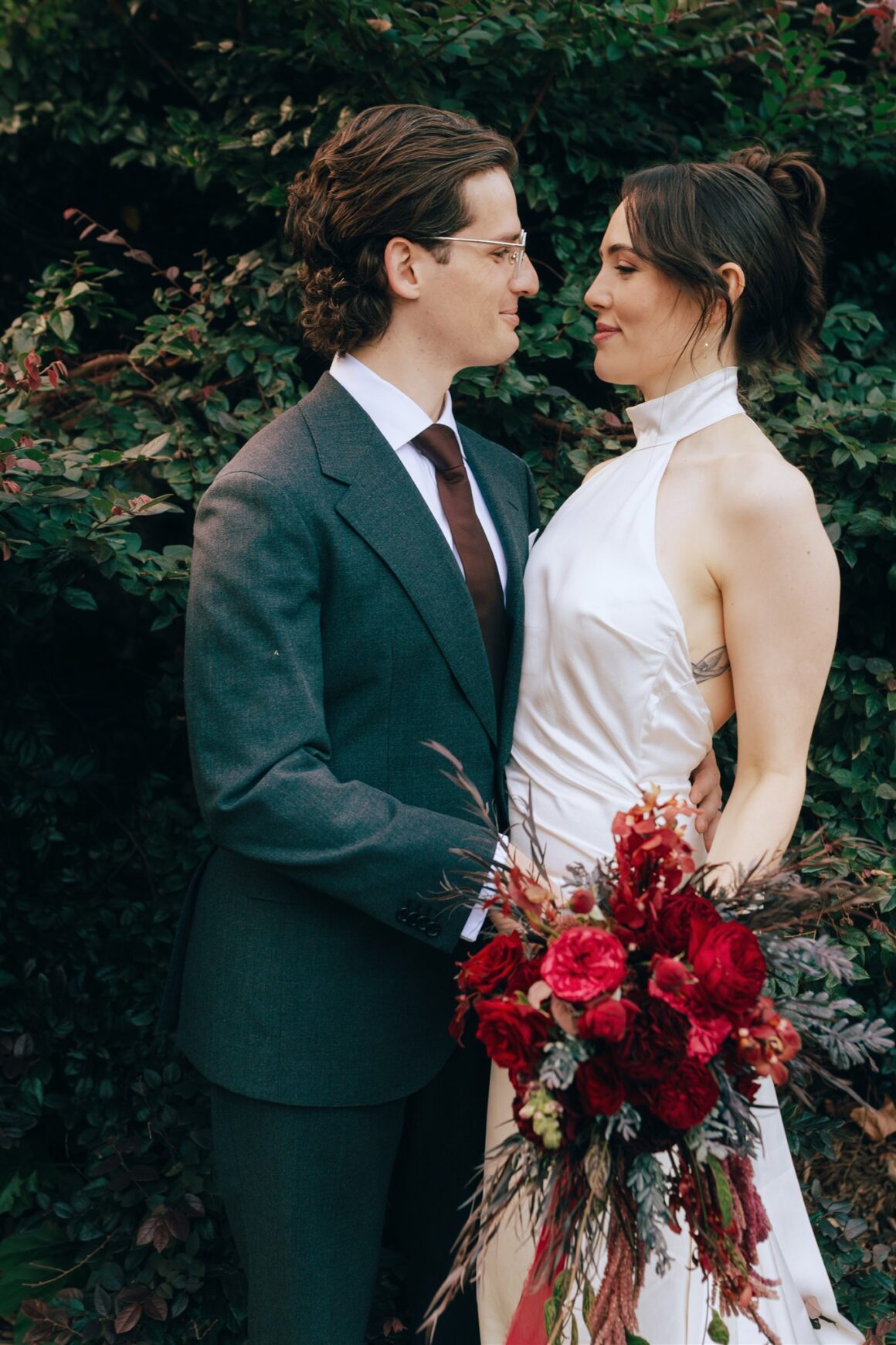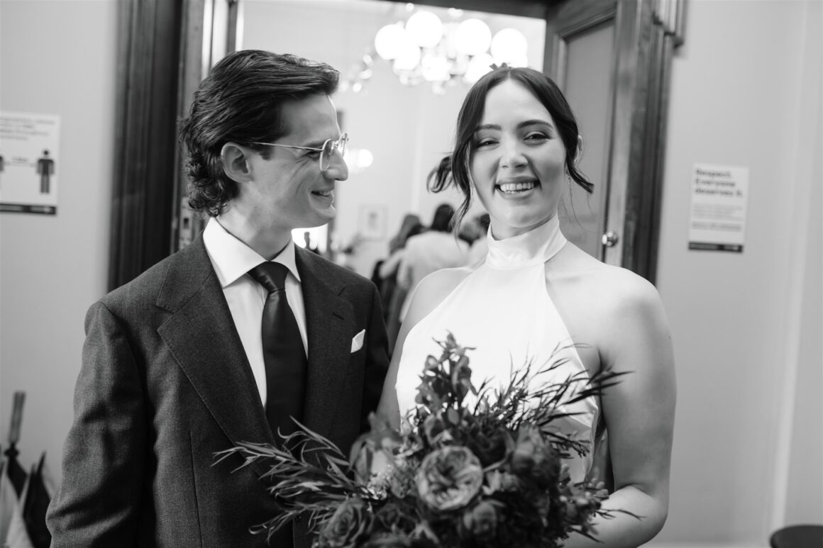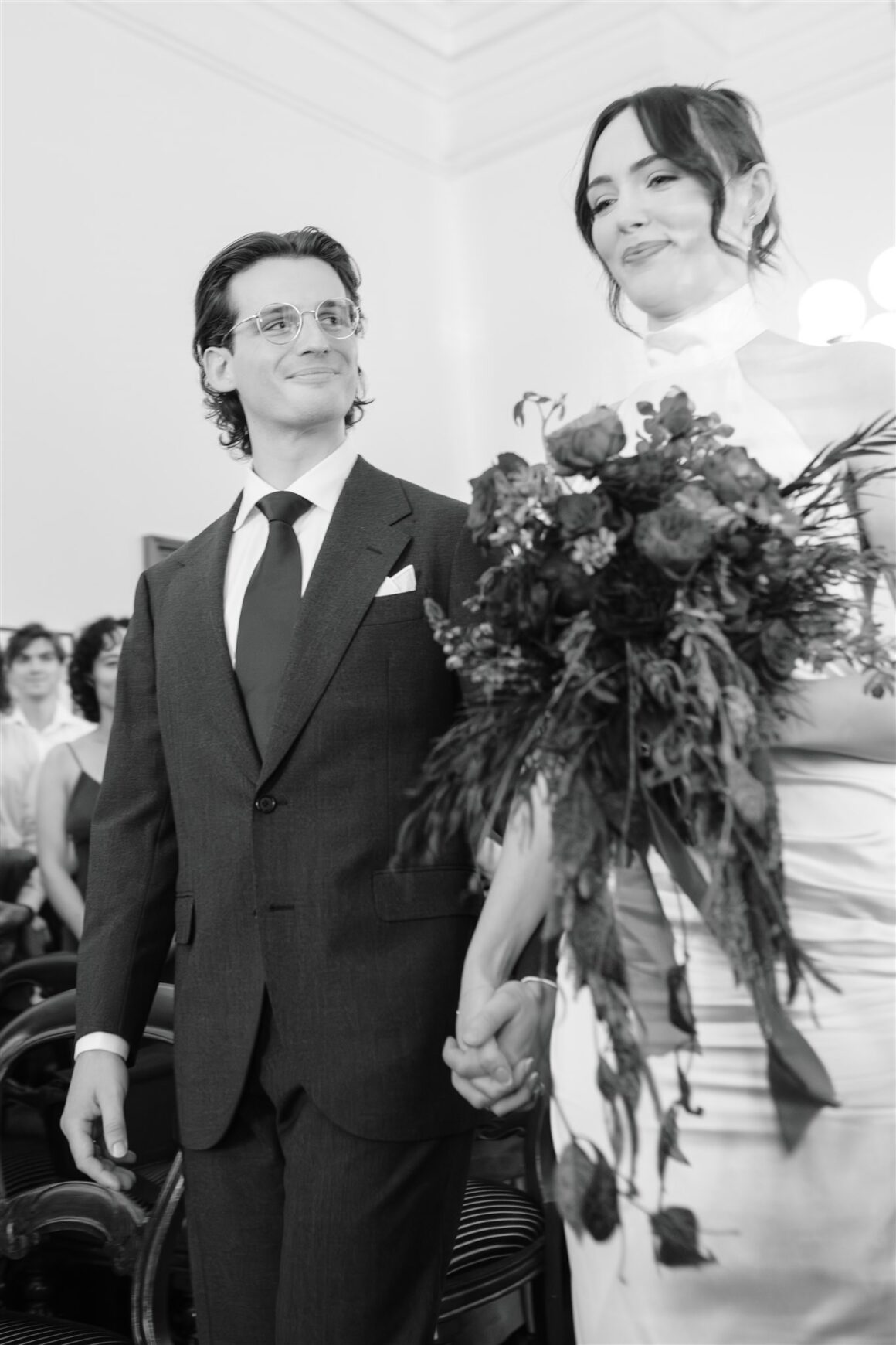 « Je pense que le moment de la journée qui me vient le plus à l'esprit a été de me promener en ville pour prendre nos photos de couple », ajoute le marié, qui a opté pour un costume P. Johnson et des boutons de manchette anciens. Dans un sentiment partagé par de nombreuses personnes qui se marient, le marié nous a dit que les préparatifs de la cérémonie avaient été flous, mais dans ces moments avec Roxanne (et la photographe Georgia Wiggs capturant les candides), tout s'est réglé. « Même si Georgia a bien sûr documenté tout le temps, elle a fait un travail formidable en nous donnant beaucoup d'espace tout en étant suffisamment présente pour prendre des photos fantastiques. »