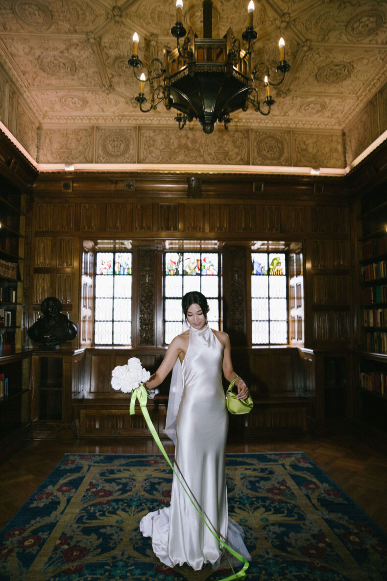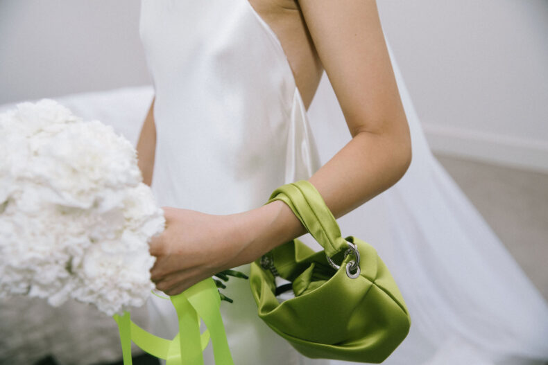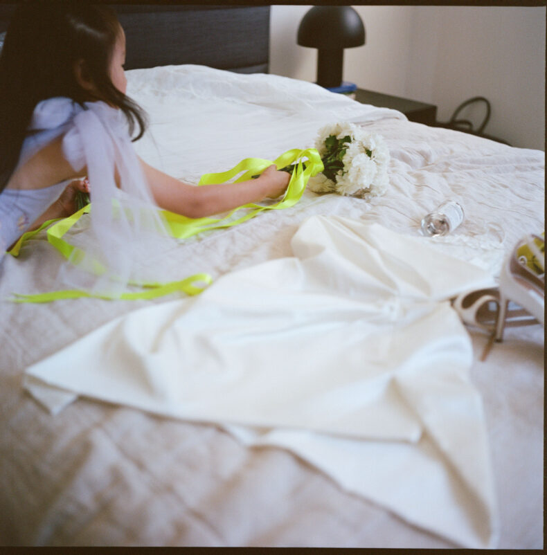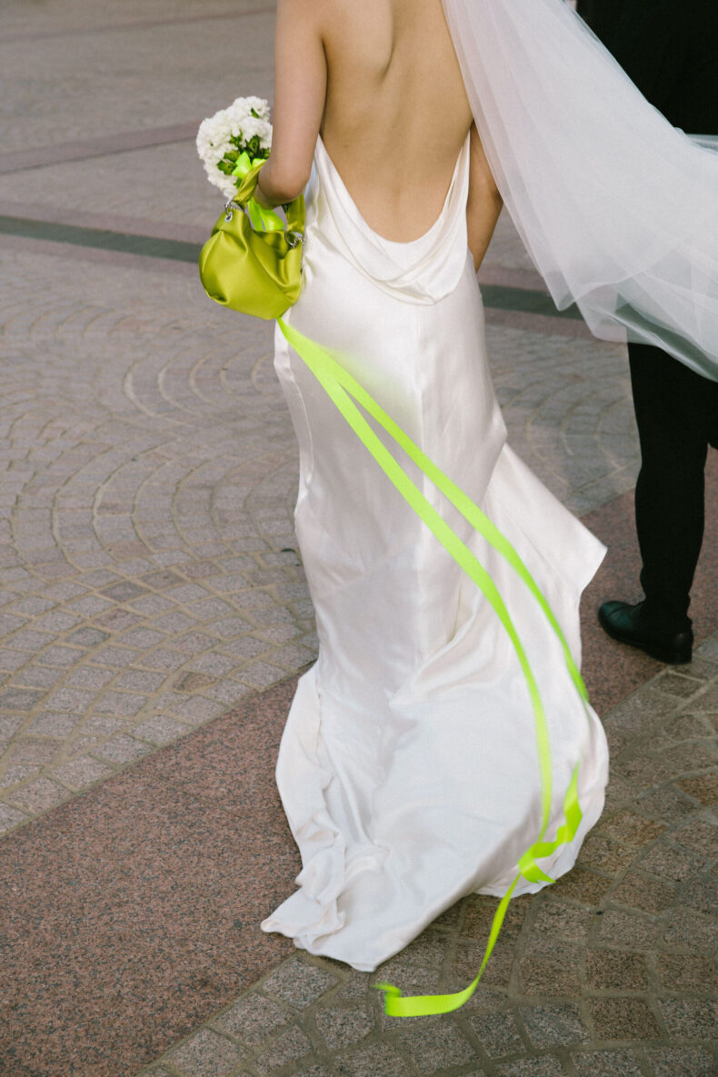 DÉTAILS PRÉFÉRÉS « Le ruban néon extra-long sur mon bouquet de Fritillerie était un élément remarquable. Je n’avais jamais vu une mariée utiliser un ruban fluo pour son bouquet de fleurs, et j’ai adoré la façon dont cela ajoutait une touche chic à mon esthétique globale.