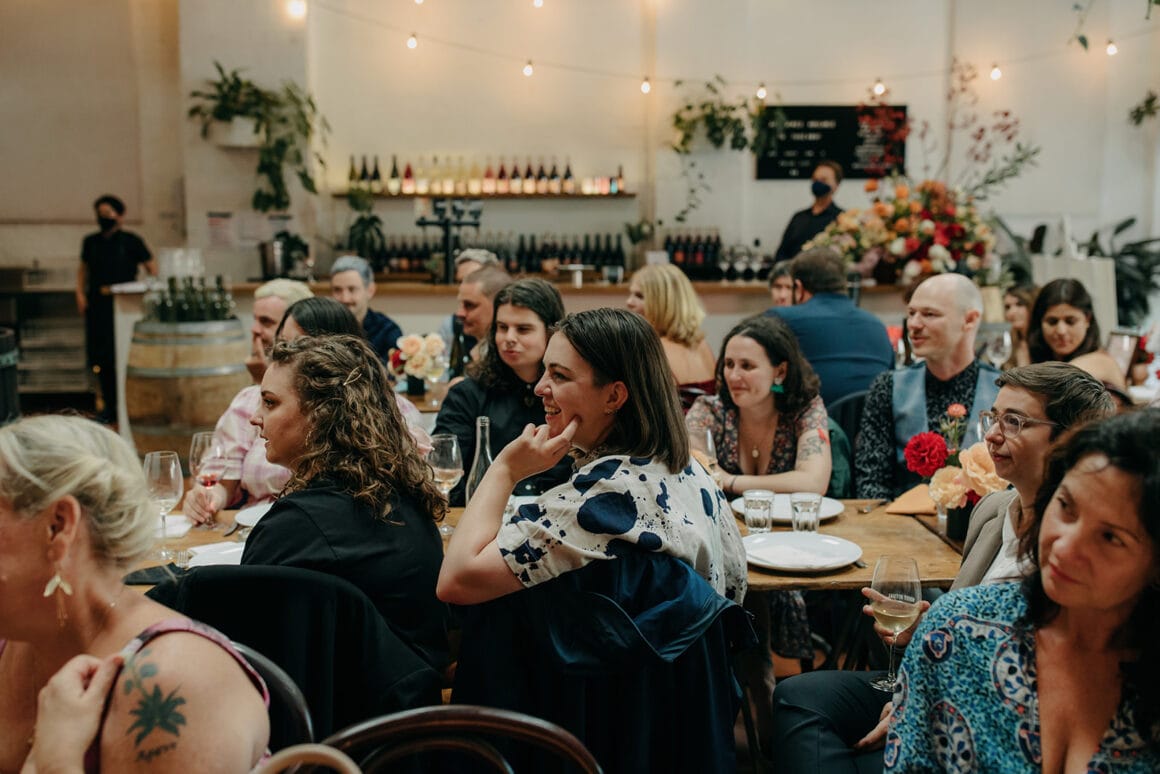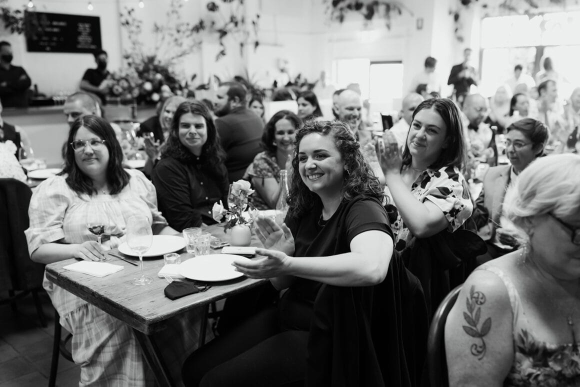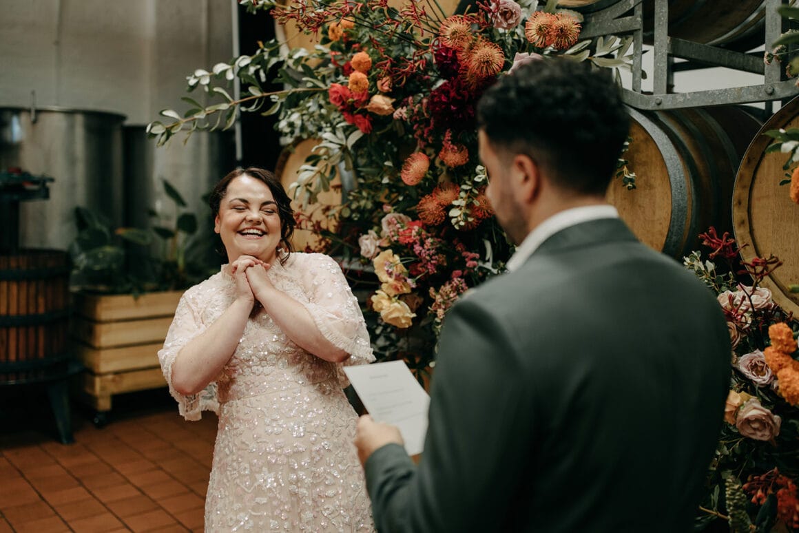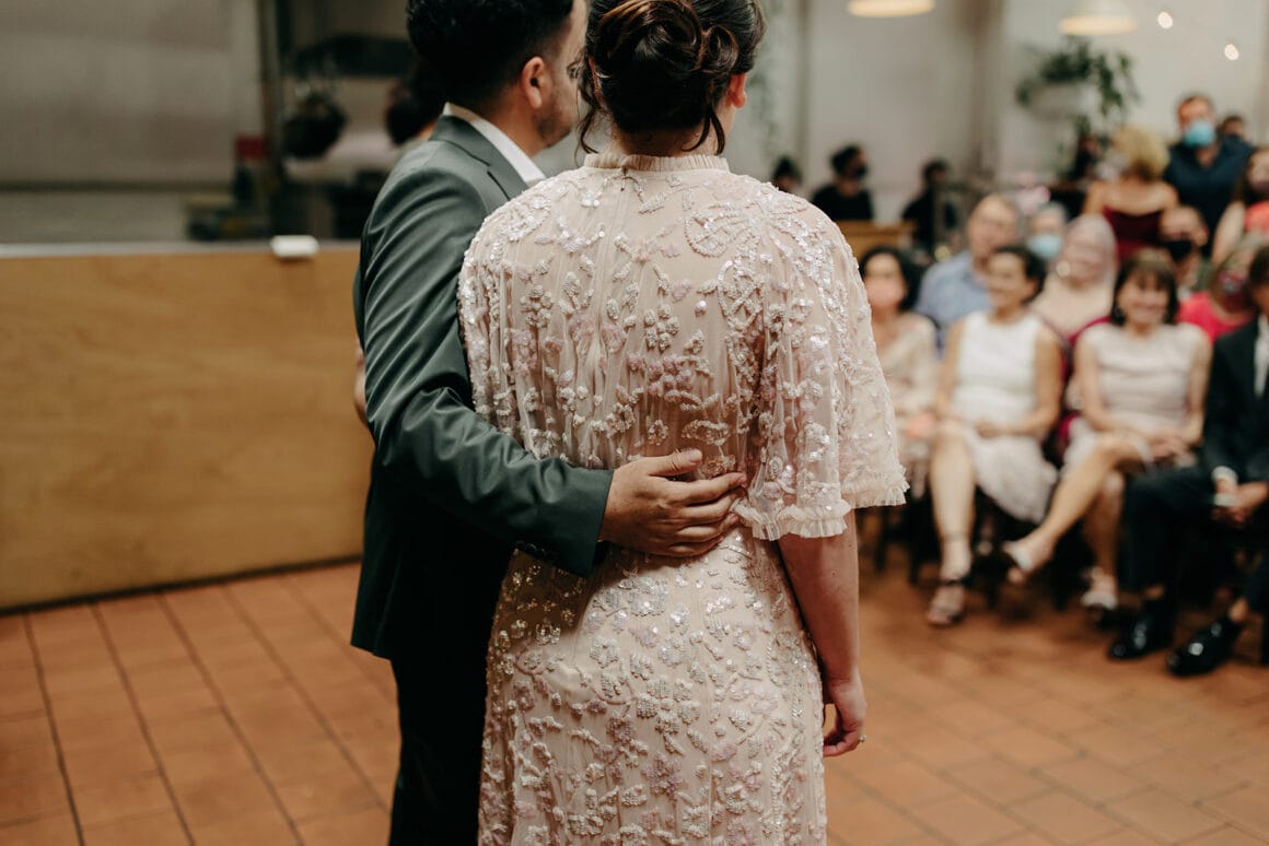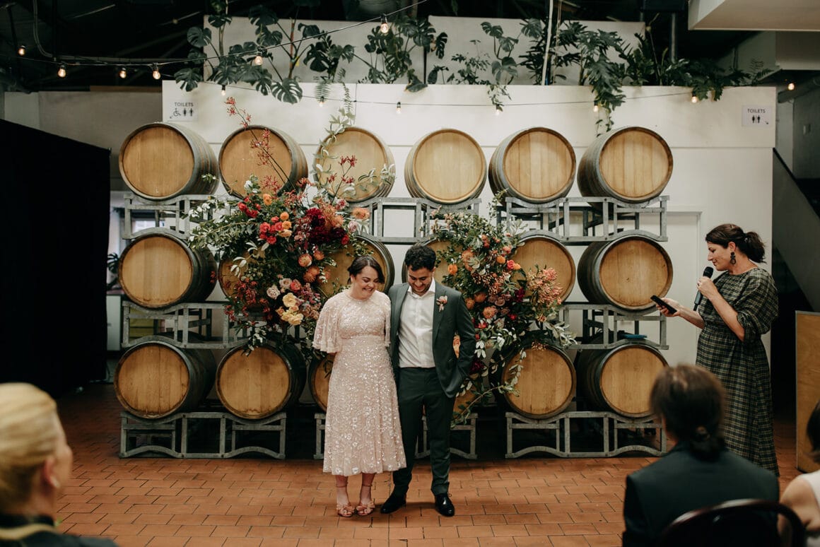 MOMENT MÉMORABLE « Mon moment préféré a été d'écouter notre cérémonie. Notre célébrant Nat Sproal a fait un travail incroyable en capturant qui nous sommes et en partageant parfaitement notre histoire. Être debout ensemble, écouter et rire avec tout le monde dans la pièce m'a aidée à me sentir moins nerveuse et plus excitée par ce qui allait se passer.