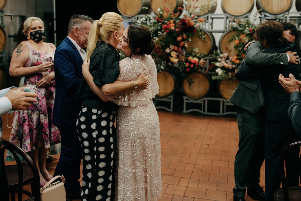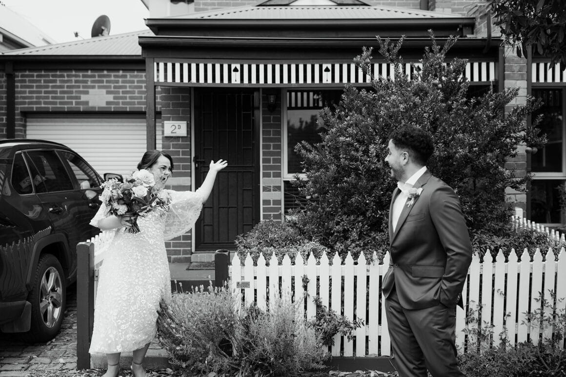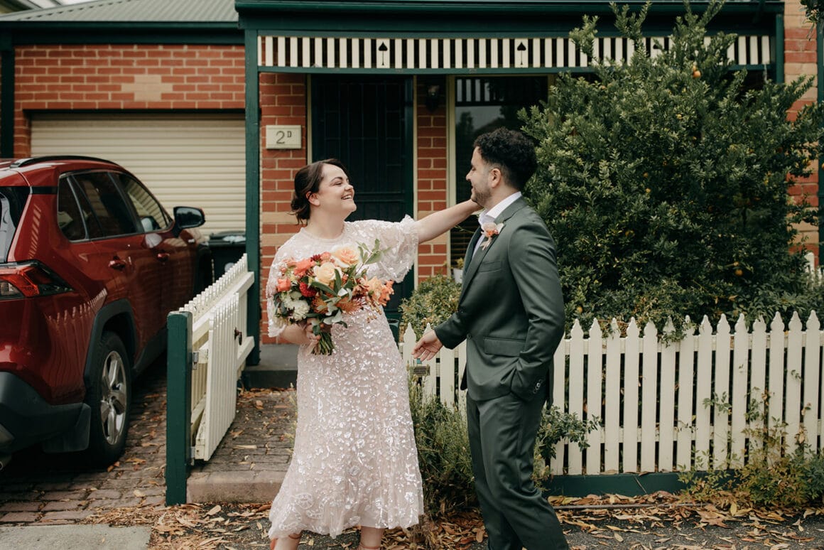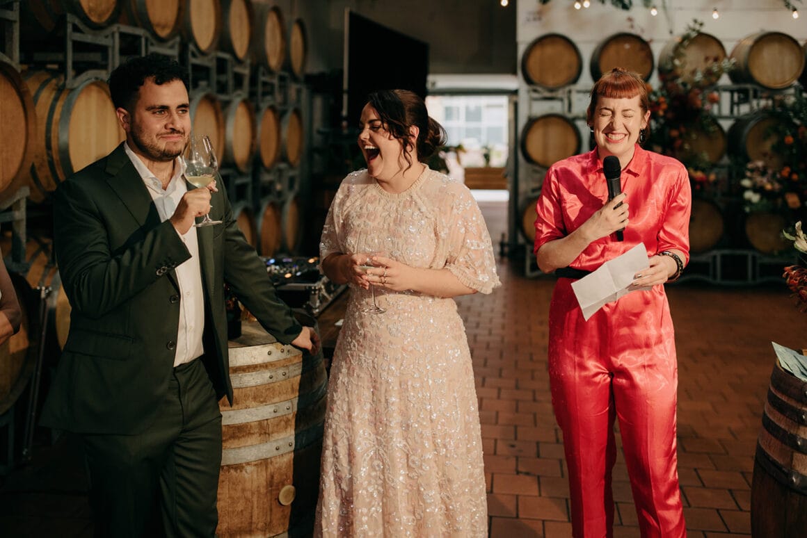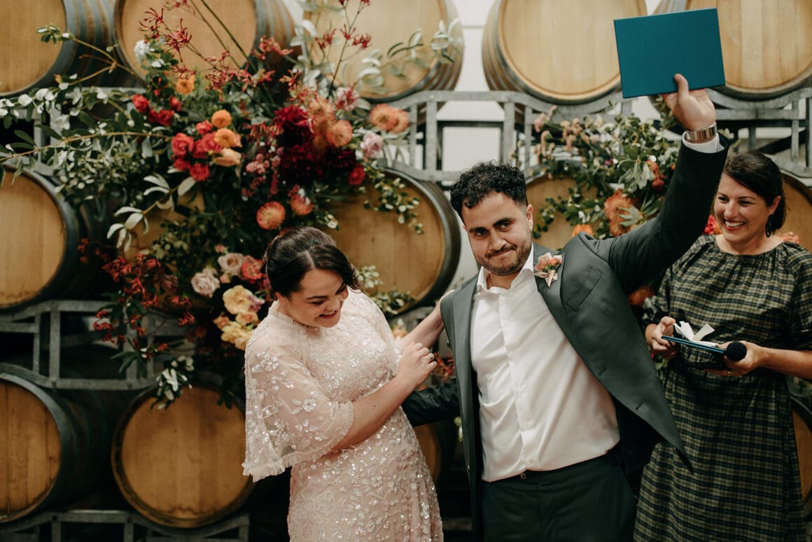 MOMENT MÉMORABLE « Mon moment préféré a été d'écouter notre cérémonie. Notre célébrant Nat Sproal a fait un travail incroyable en capturant qui nous sommes et en partageant parfaitement notre histoire. Être debout ensemble, écouter et rire avec tout le monde dans la pièce m'a aidée à me sentir moins nerveuse et plus excitée par ce qui allait se passer.