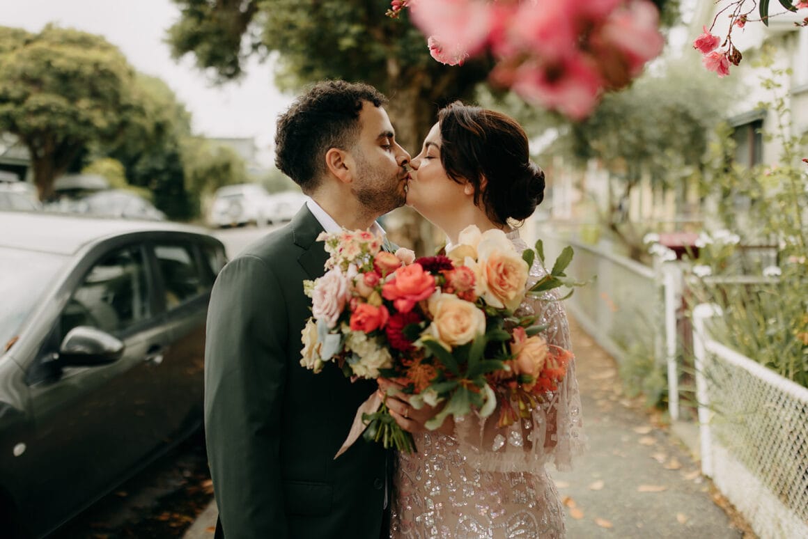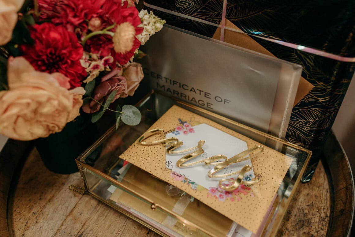 NOUS SOMMES HEUREUX DE NOUS… « Nous avons fait beaucoup de photos avant la cérémonie. Nous avons jeté un premier coup d'œil, puis avons passé environ une heure à parcourir les rues près de chez nous pour réaliser des portraits. Cela nous a vraiment aidé avec nos nerfs et nous avons pu nous familiariser avec notre incroyable photographe Kyra ! Kyra prenait des photos et discutait avec nous tout le temps. C’était un de mes moments préférés. Cela nous a également permis de passer plus de temps à notre réception avec nos amis et notre famille.