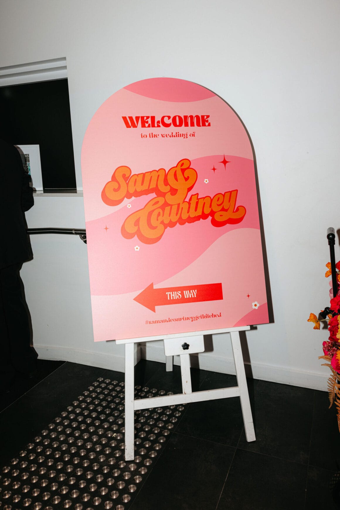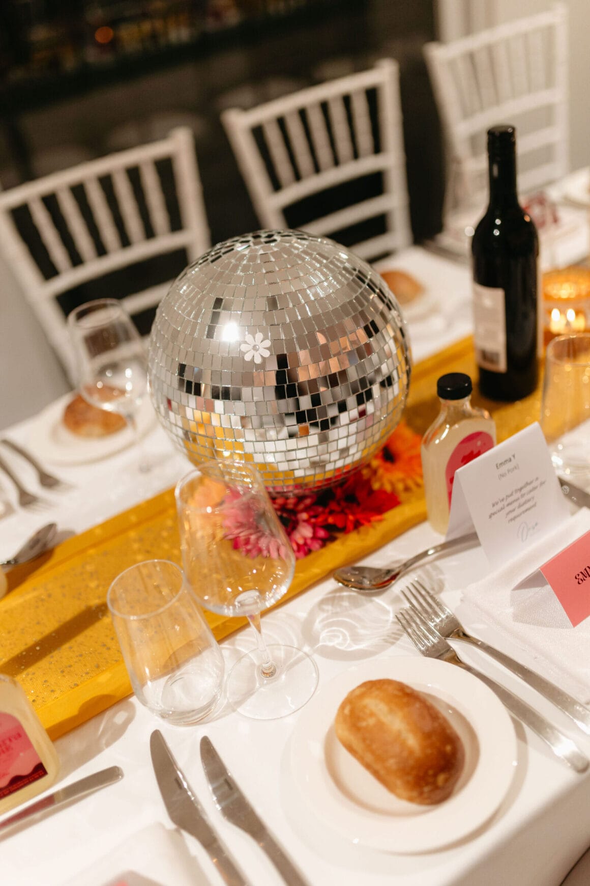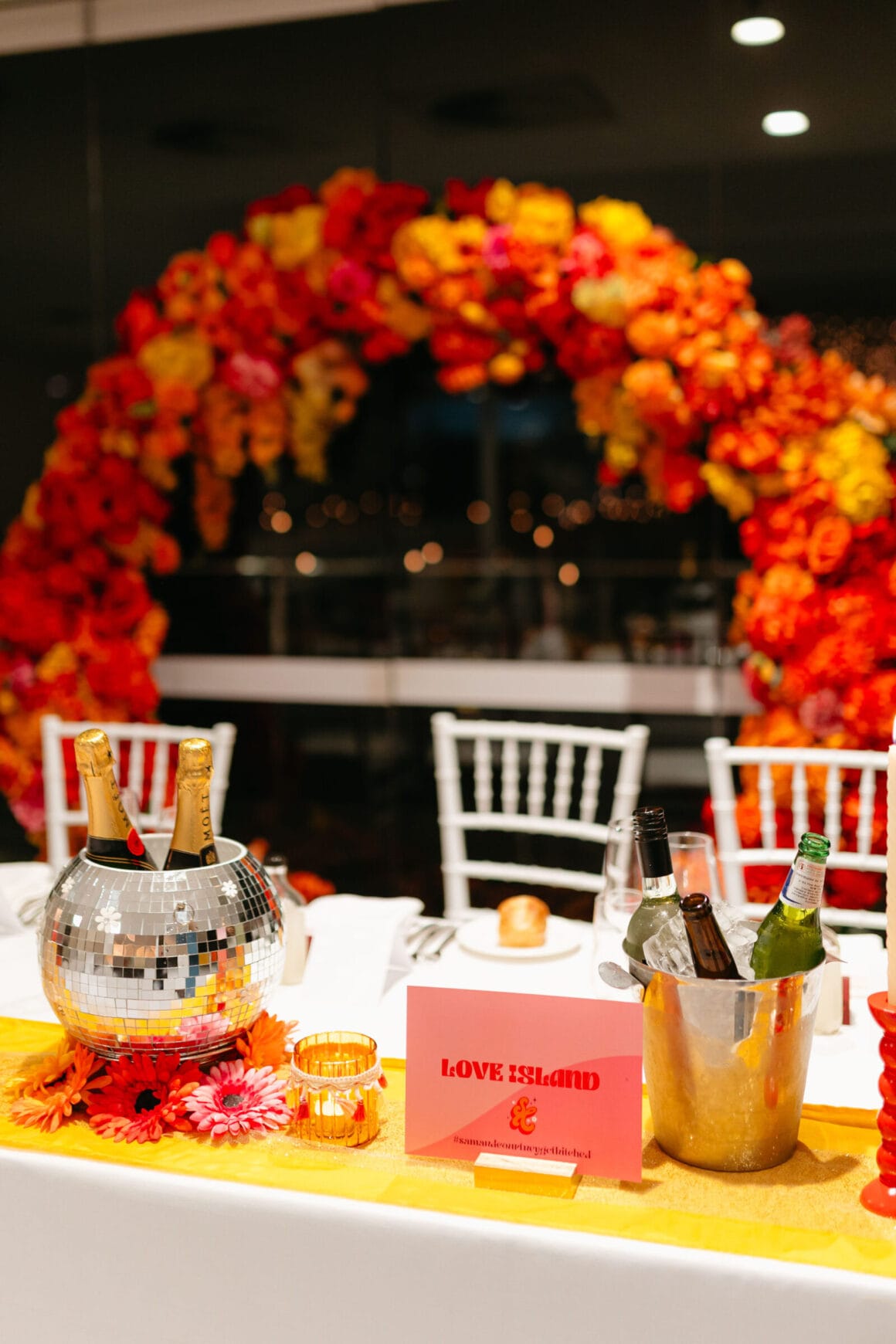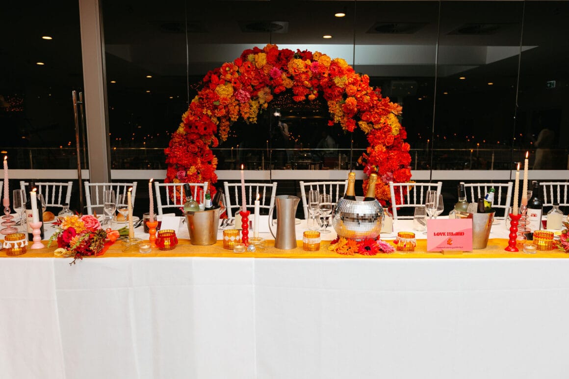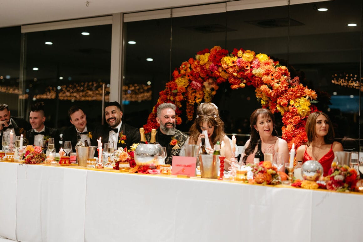 L'ambiance «Notre thème de couleur a atterri sur les rayures du coucher du soleil disco des années 70 avec une touche de marguerites». Gradient d'or vif, jaune, orange, rose et rouge avec de petites marguerites blanches partout – nous voulions coloré, amusant et vibrant! Nos merveilleux invités sont une vaste gamme de personnages et de nombreux créatifs, donc notre code vestimentaire était « Cocktail formel, avec une touche de personnalité ' Beaucoup de touches de couleur!