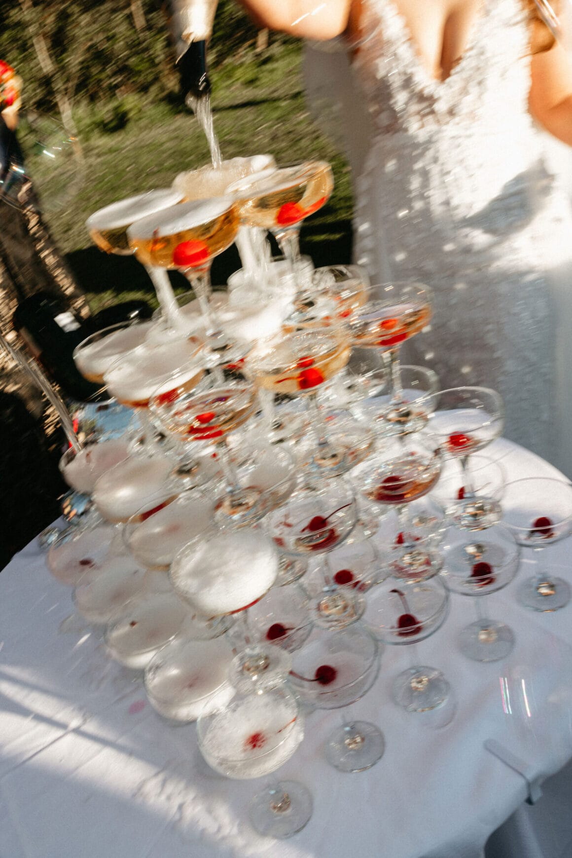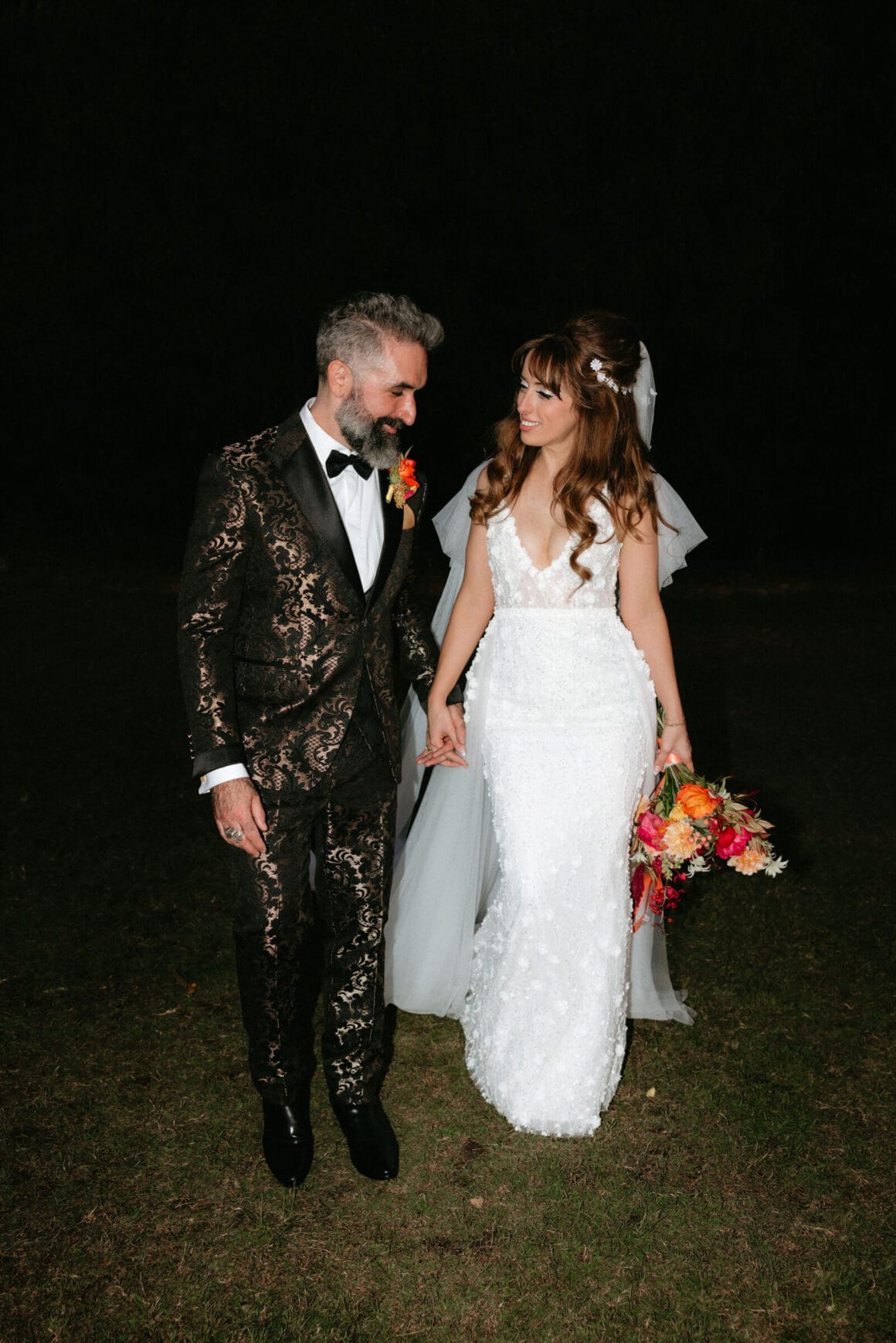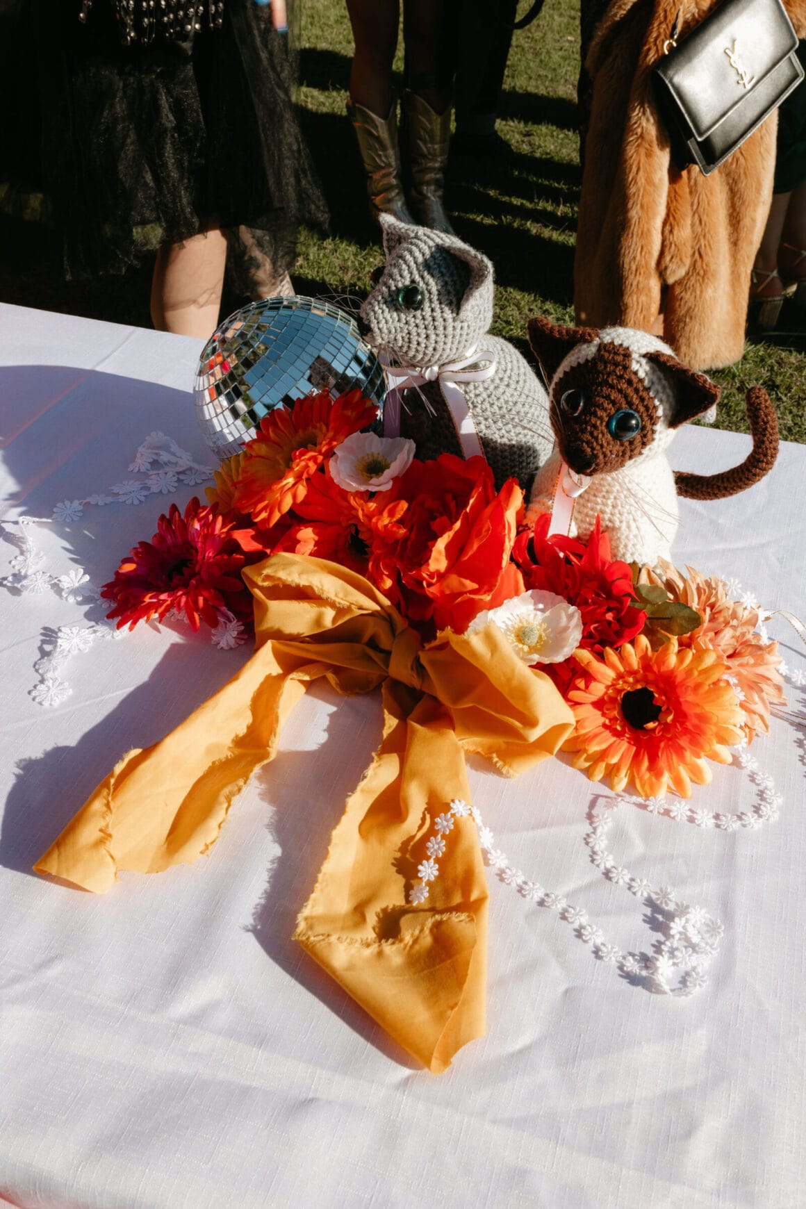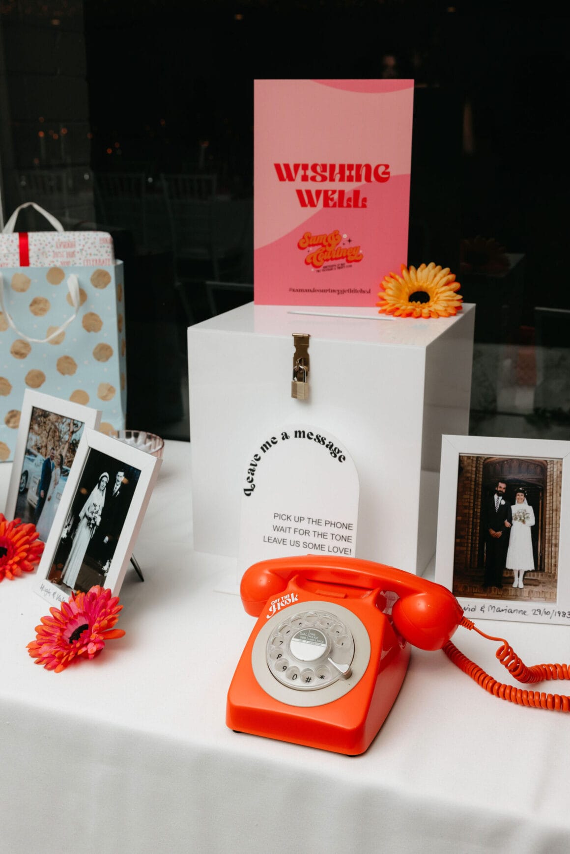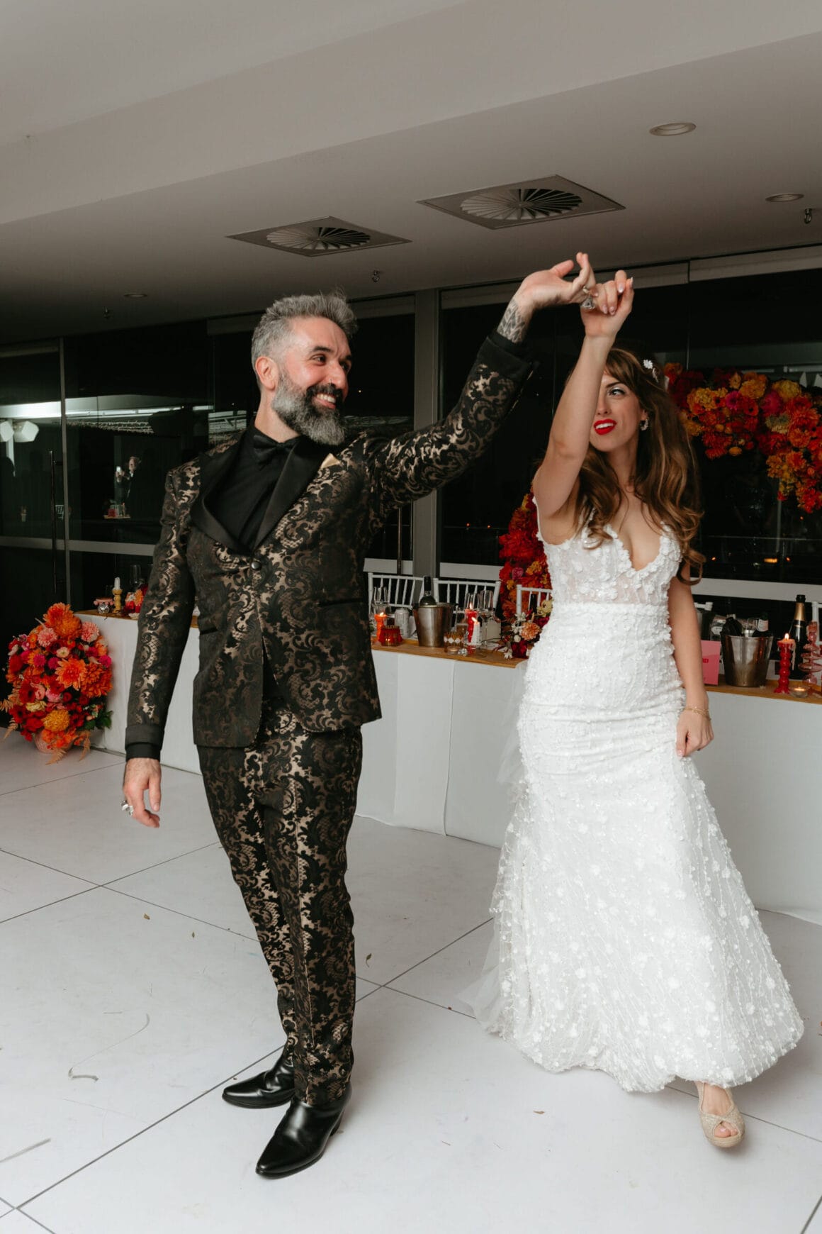 L'ambiance «Notre thème de couleur a atterri sur les rayures du coucher du soleil disco des années 70 avec une touche de marguerites». Gradient d'or vif, jaune, orange, rose et rouge avec de petites marguerites blanches partout – nous voulions coloré, amusant et vibrant! Nos merveilleux invités sont une vaste gamme de personnages et de nombreux créatifs, donc notre code vestimentaire était « Cocktail formel, avec une touche de personnalité ' Beaucoup de touches de couleur!