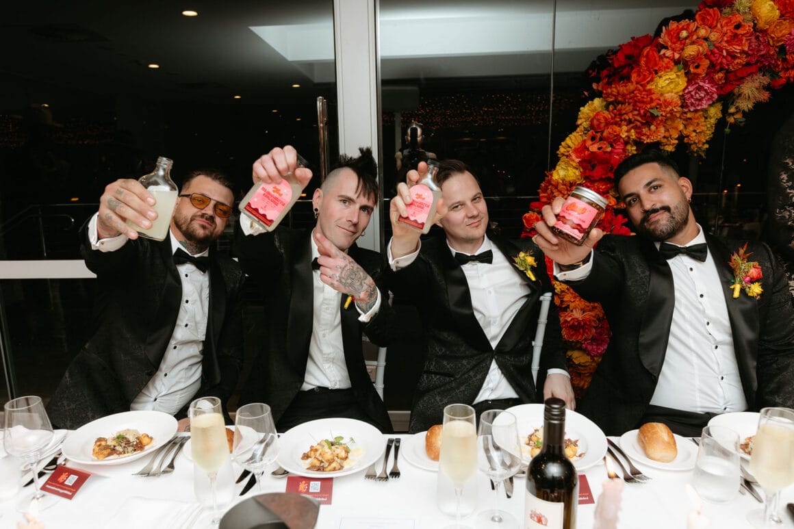 Détails préférés «Hors le crochet a livré un livre d'or audio prêt à aller avec des retours faciles qui était si amusant de recevoir Mid-HoneyMoon, et au moment où nous sommes revenus, il y avait un enregistrement personnalisé de tous les messages prêts à écouter pour nous à écouter à. L'arcche et les fleurs absolument superbes Pia (Culture Beat Creative) a créé pour nous – beaucoup de fleurs ont peint à la main à notre palette de couleurs et assemblé avec un tel œil pour le détail. Elle a conçu l'arche d'une manière qu'il pourrait facilement être abattu et déplacé vers la table nuptiale à la réception qui a vraiment égayé la pièce! Aussi notre Margarita en bouteille Favors, faite à la main par notre local préféré The Hive Bar à Erskineville. Nous avons eu notre premier rendez-vous à The Hive et nous avons eu de nombreux souvenirs amusants, événements et délicieux margaritas là-bas.