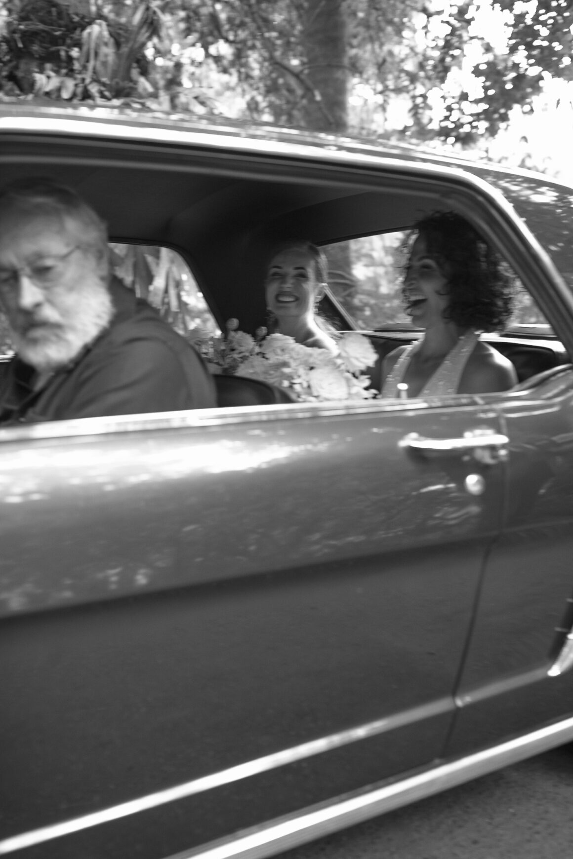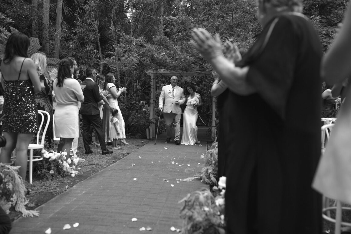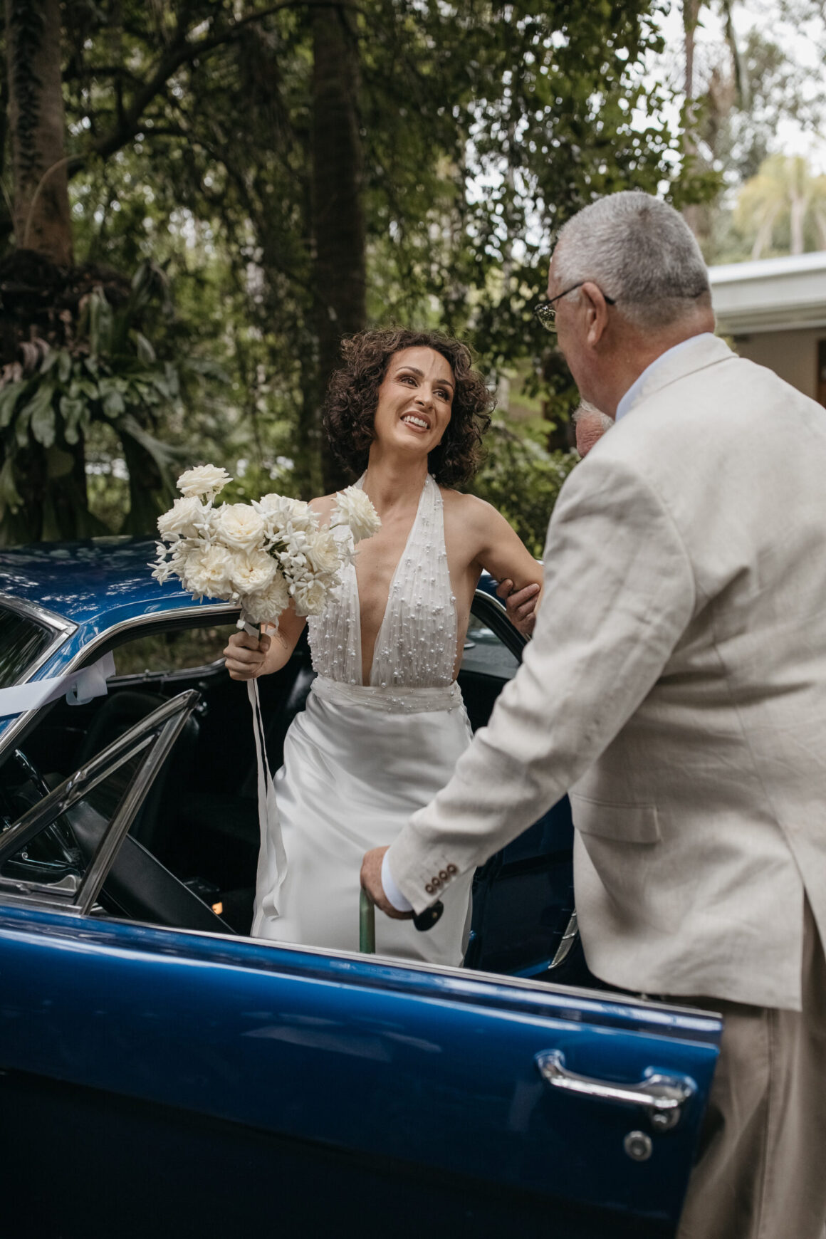 « Quand J est sortie de la voiture, sa sœur a rapidement remis le bouquet à leur père pour qu'elle puisse ajuster le nœud de la robe. Dans toute l'excitation de la faire descendre dans l'allée… il a juste continué à le tenir et l'a fièrement accompagnée en tenant toujours les fleurs dans ses bras ! Honnêtement, cela lui allait vraiment bien. Un vrai moment de papa fleur ! »