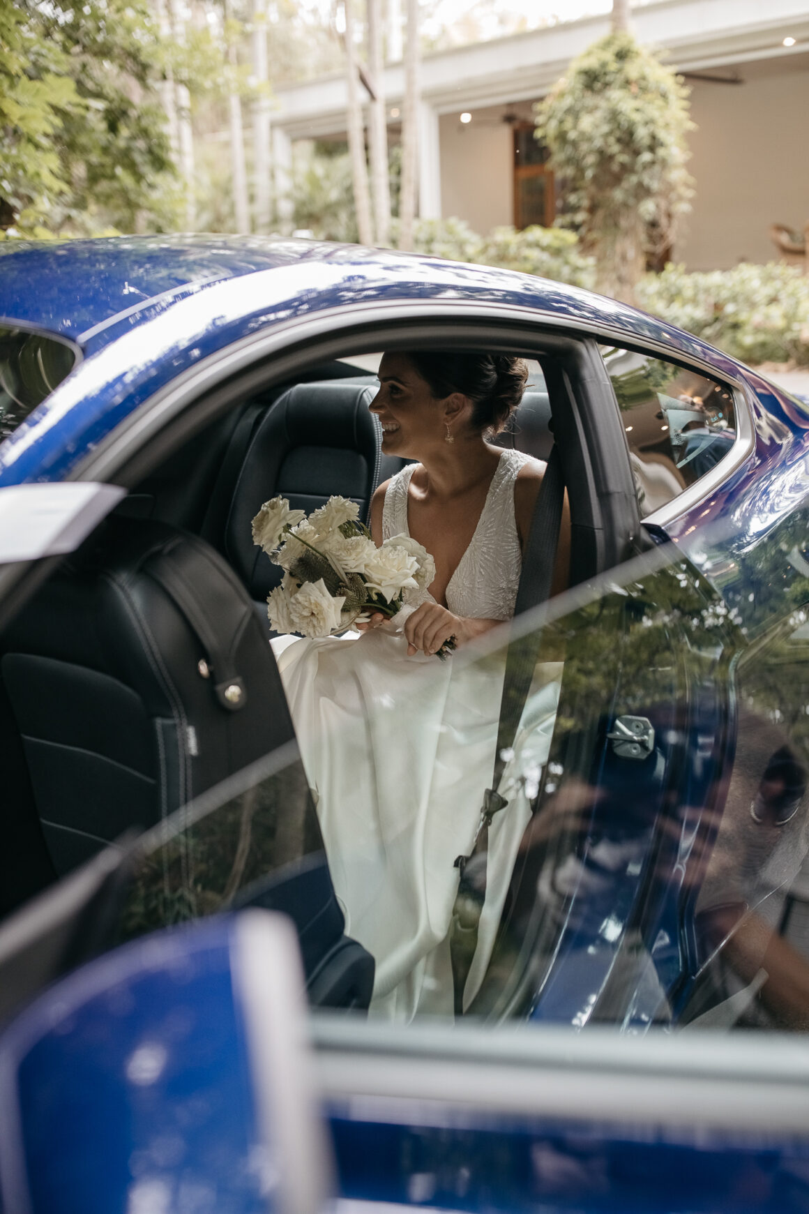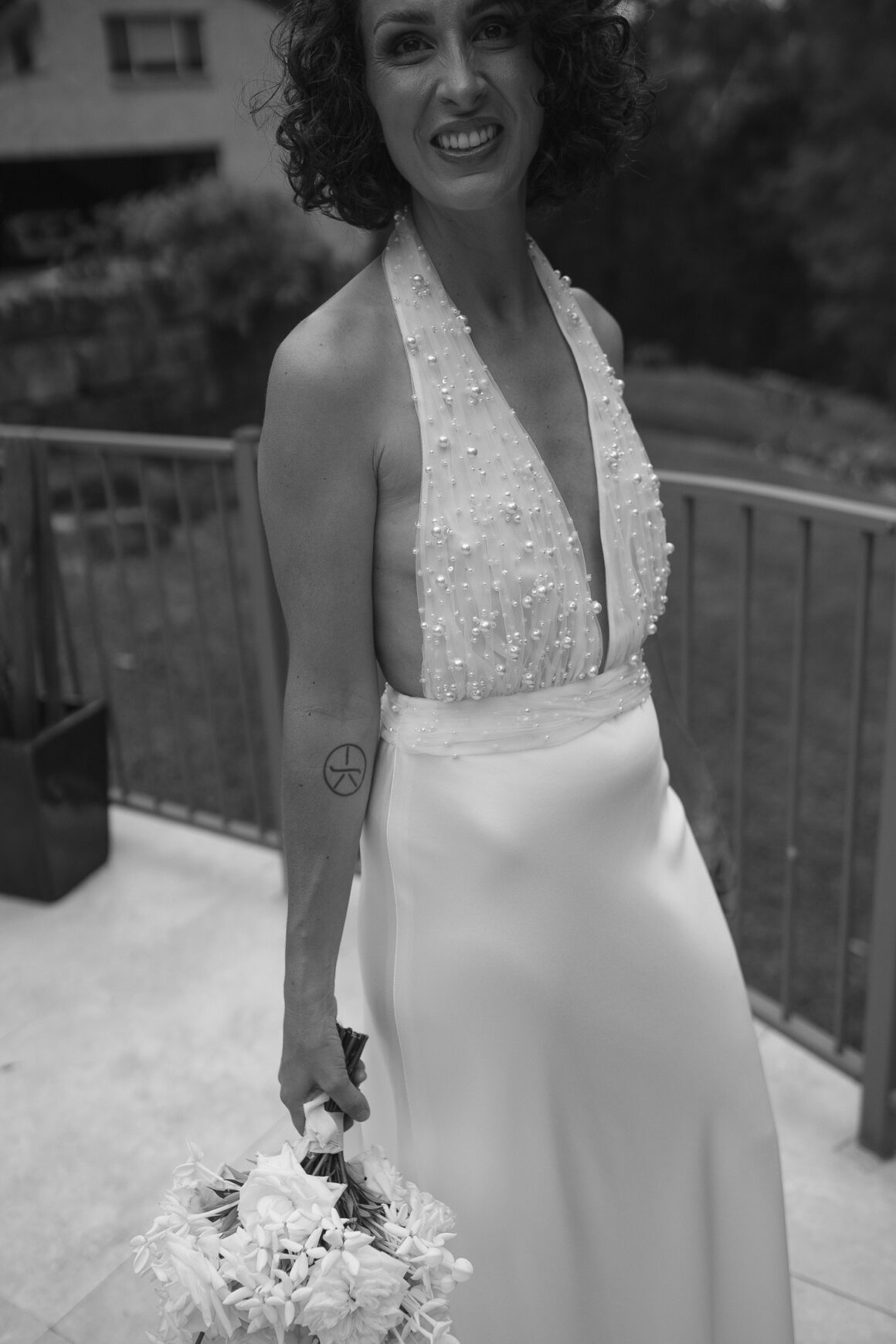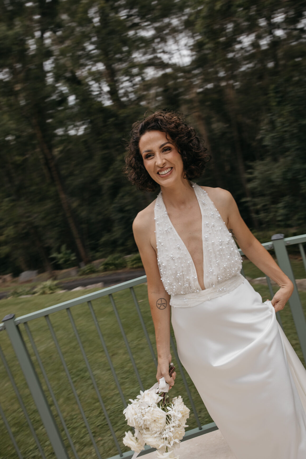 « Quand J est sortie de la voiture, sa sœur a rapidement remis le bouquet à leur père pour qu'elle puisse ajuster le nœud de la robe. Dans toute l'excitation de la faire descendre dans l'allée… il a juste continué à le tenir et l'a fièrement accompagnée en tenant toujours les fleurs dans ses bras ! Honnêtement, cela lui allait vraiment bien. Un vrai moment de papa fleur ! »
