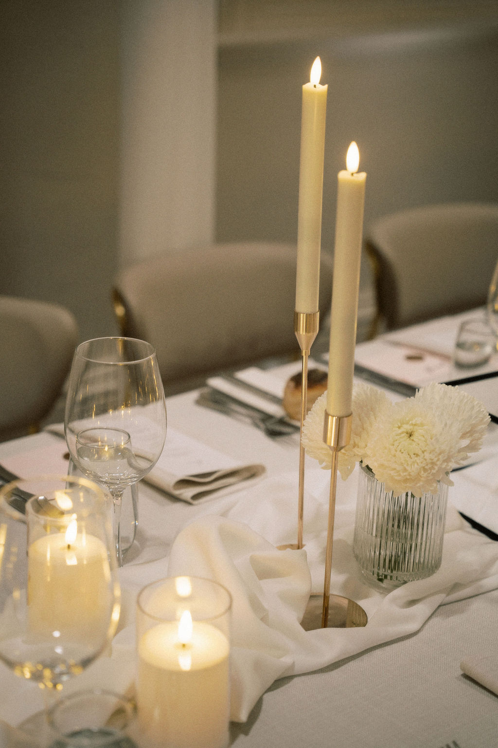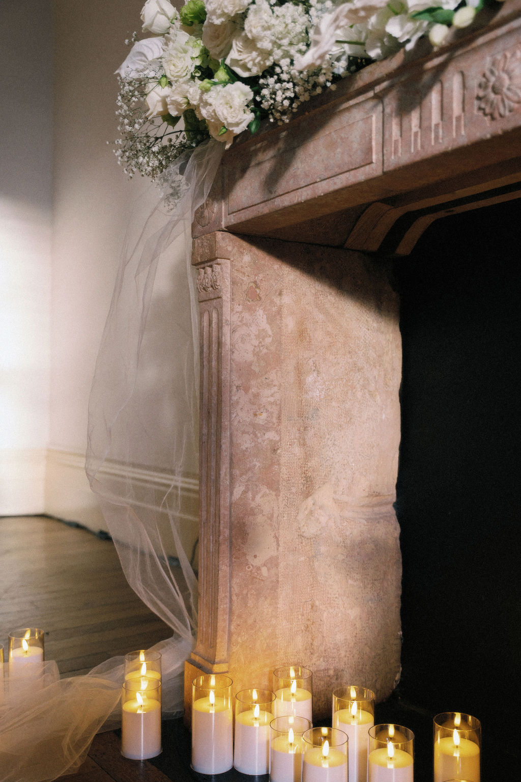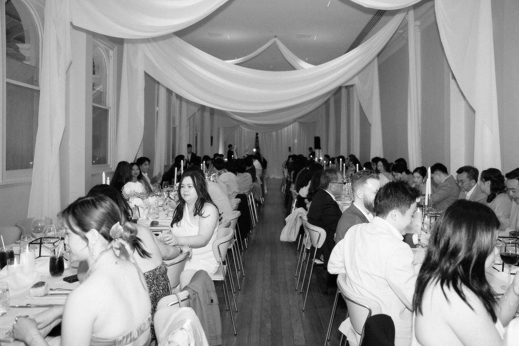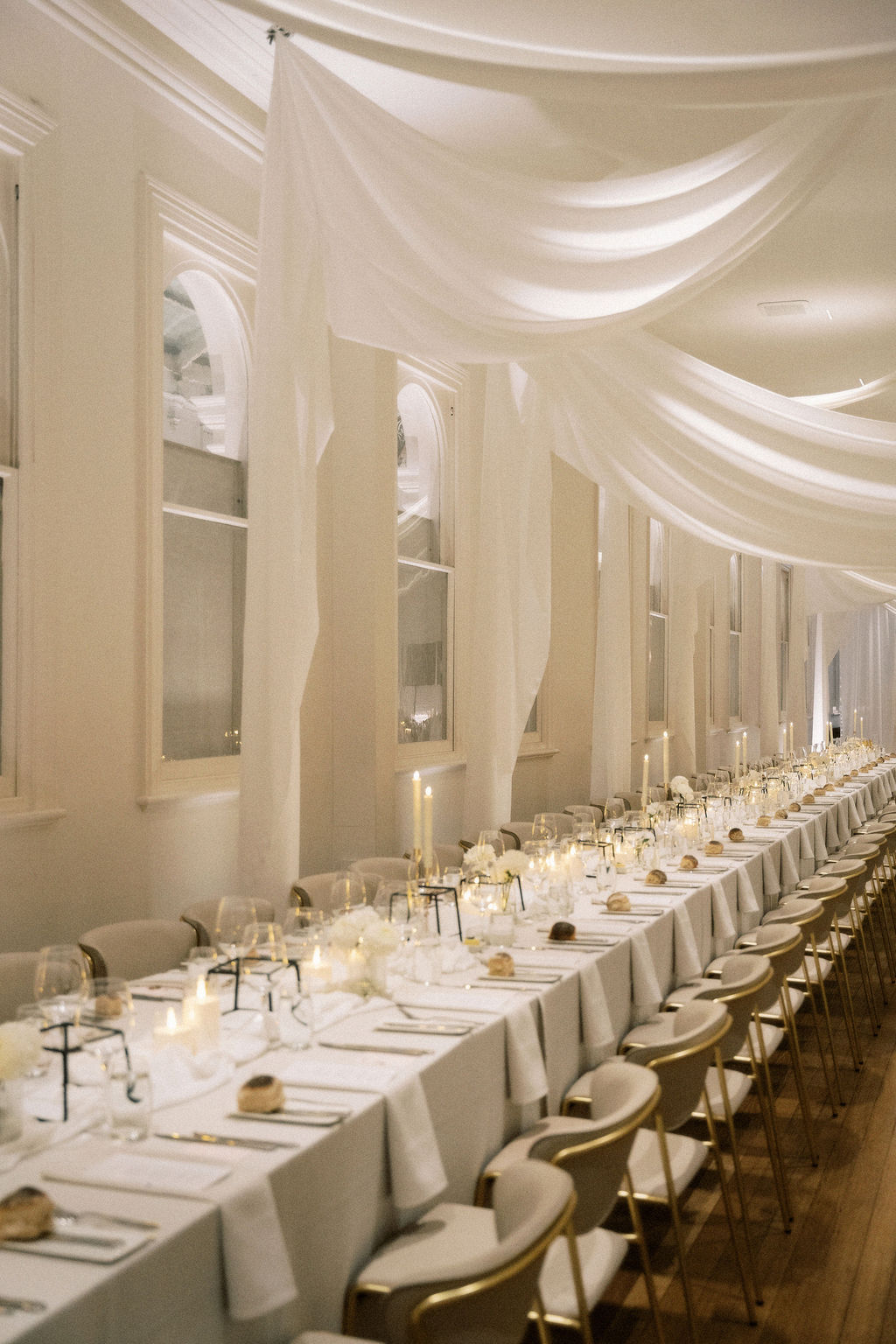 « L'un de nos éléments de conception préférés de la réception était l'installation des drapés. Le plafond élancé de The Gallery nous a donné la toile parfaite pour transformer complètement l'espace, et les rideaux doux et fluides ont ajouté un beau sentiment d'intimité à la pièce longue et étroite. Les drapés ont créé une atmosphère romantique, presque éthérée, adoucissant les bords hauts de l'espace, encadrant parfaitement les fenêtres cintrées et attirant le regard vers le haut pour souligner l'incroyable hauteur du plafond. Il a également ancré visuellement les tables à manger en dessous, donnant l'impression que la pièce chaleureux, accueillant et cohérent tout en conservant sa grande présence architecturale.