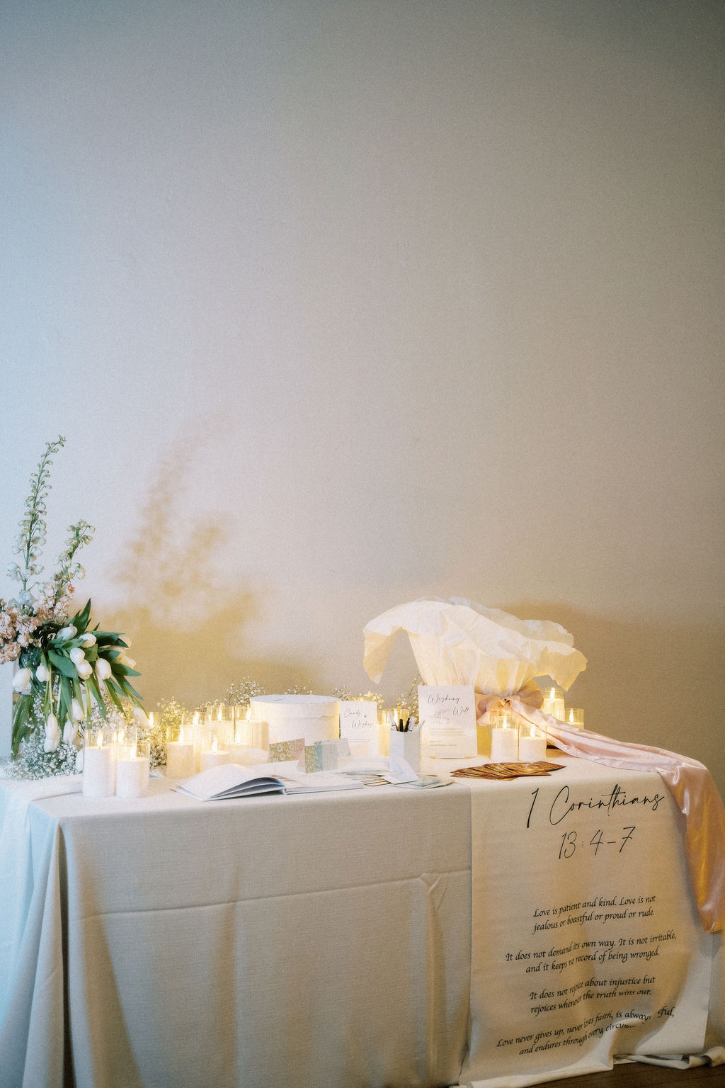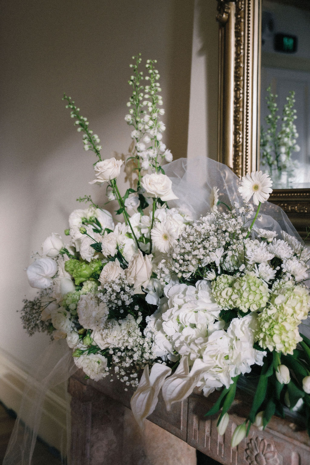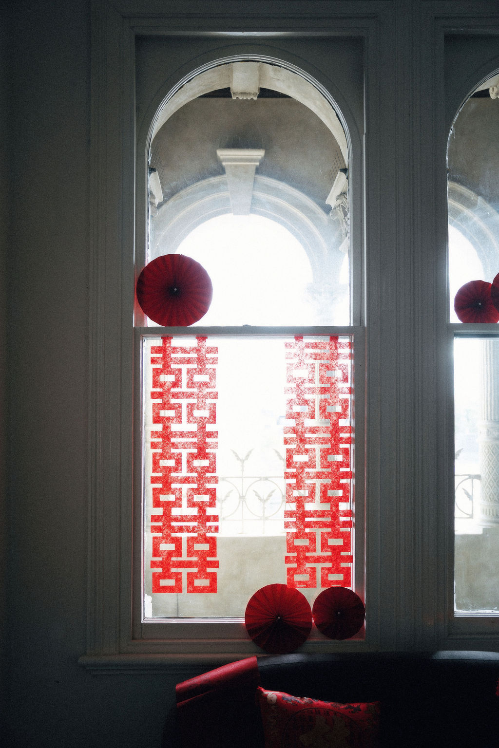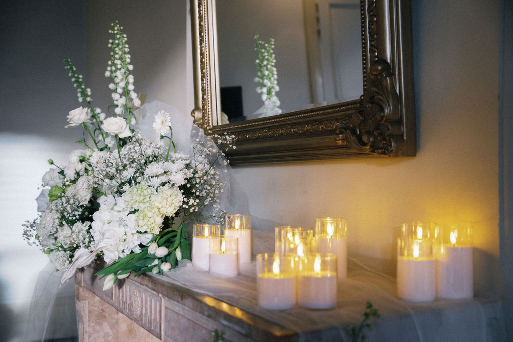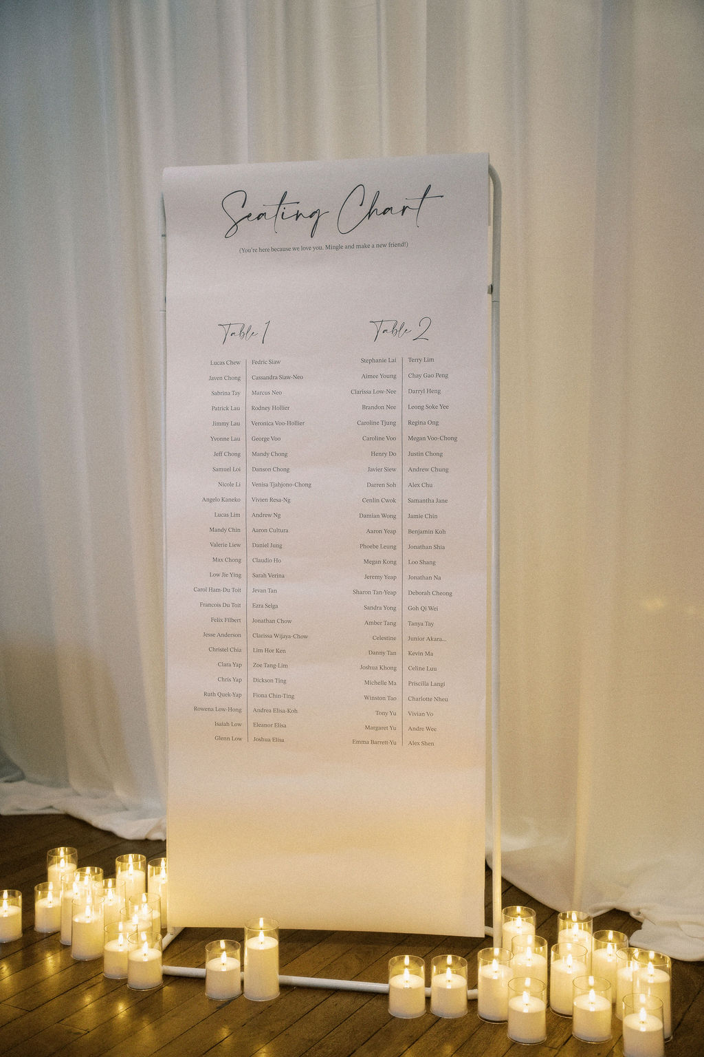 « L'un de nos éléments de conception préférés de la réception était l'installation des drapés. Le plafond élancé de The Gallery nous a donné la toile parfaite pour transformer complètement l'espace, et les rideaux doux et fluides ont ajouté un beau sentiment d'intimité à la pièce longue et étroite. Les drapés ont créé une atmosphère romantique, presque éthérée, adoucissant les bords hauts de l'espace, encadrant parfaitement les fenêtres cintrées et attirant le regard vers le haut pour souligner l'incroyable hauteur du plafond. Il a également ancré visuellement les tables à manger en dessous, donnant l'impression que la pièce chaleureux, accueillant et cohérent tout en conservant sa grande présence architecturale.