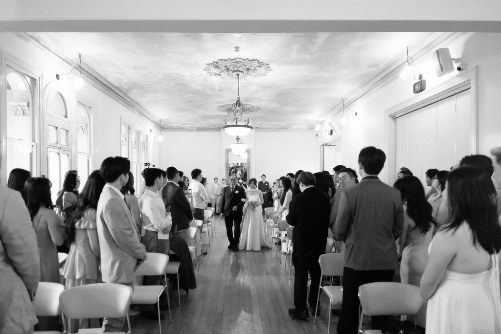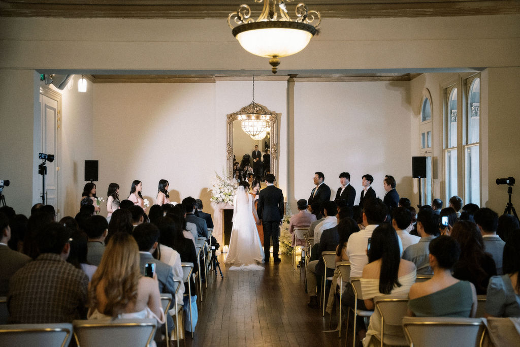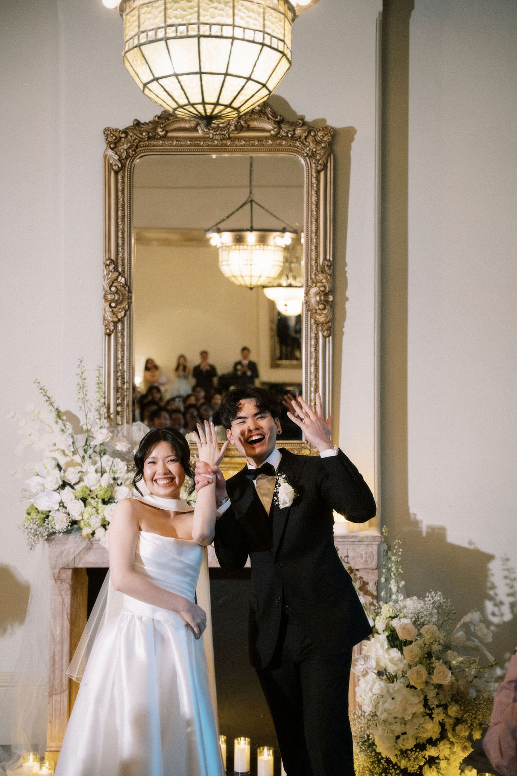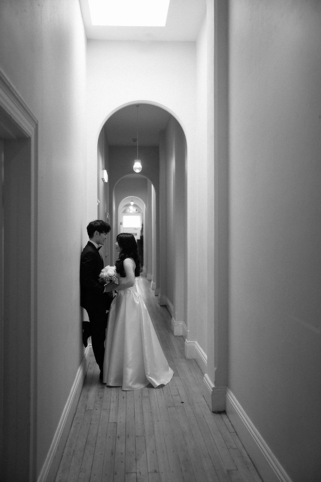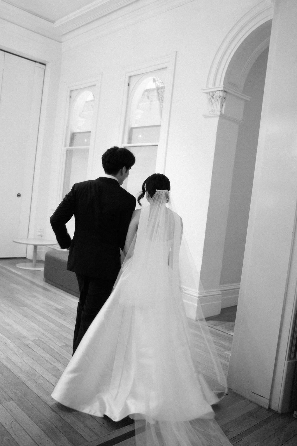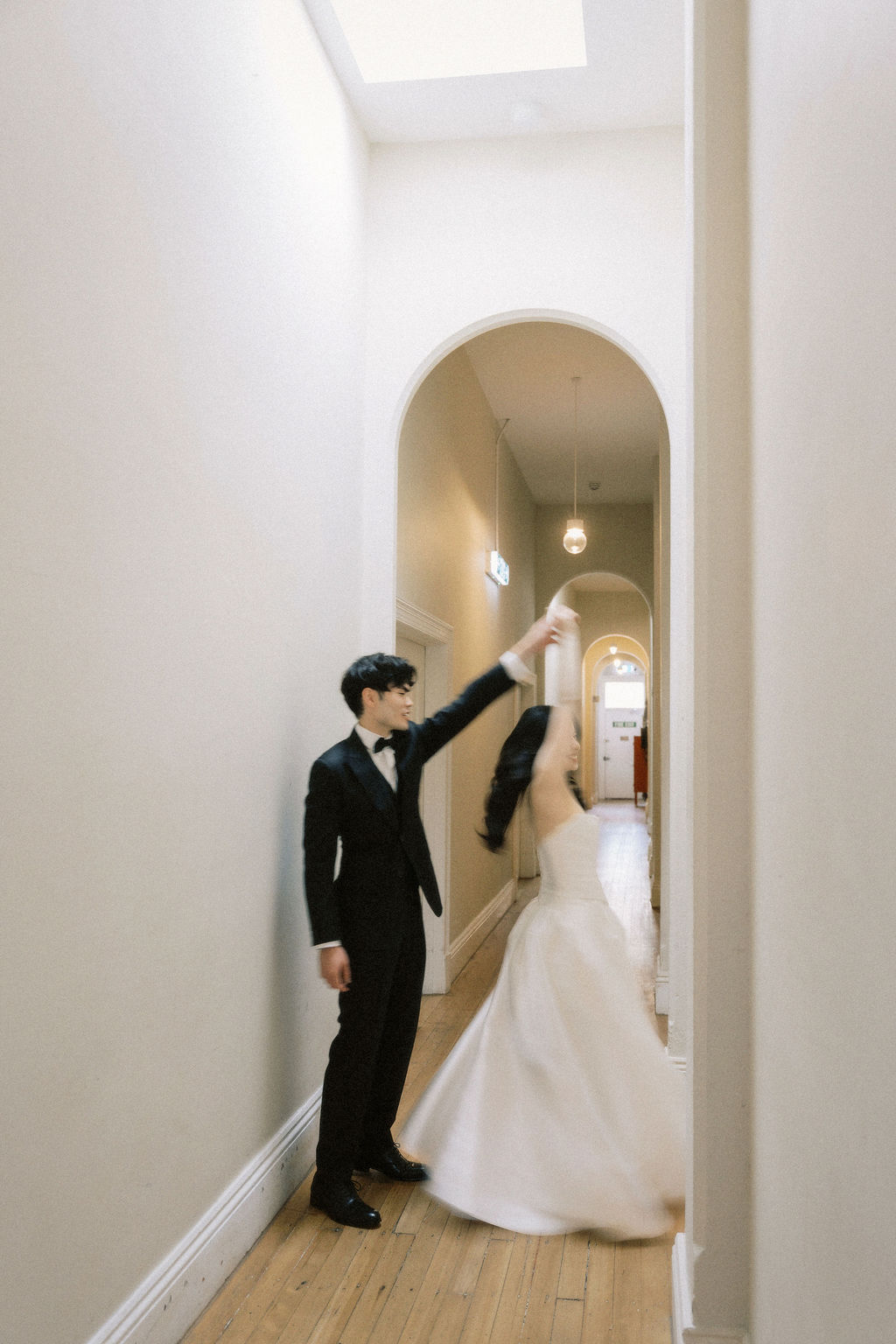 Lorsqu’il s’agissait d’organiser leur journée de rêve, ce couple créatif, qui travaille tous deux dans le domaine de l’architecture, était dès le départ sur la même longueur d’onde. «Élégant, intemporel et chic», tel était le brief, un lieu de mariage intérieur avec «un fort caractère architectural et de beaux détails». Ainsi, lorsqu’ils ont visité l’endroit qui allait devenir leur espace – Sophia au Prahran Arcade – ce fut, naturellement, un « coup de foudre ».