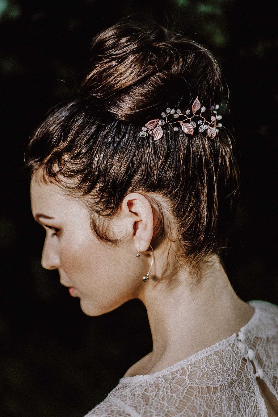 diadème mi-long composé de perles et de feuilles cuivrées, veste en dentelle, bijoux fantaisie