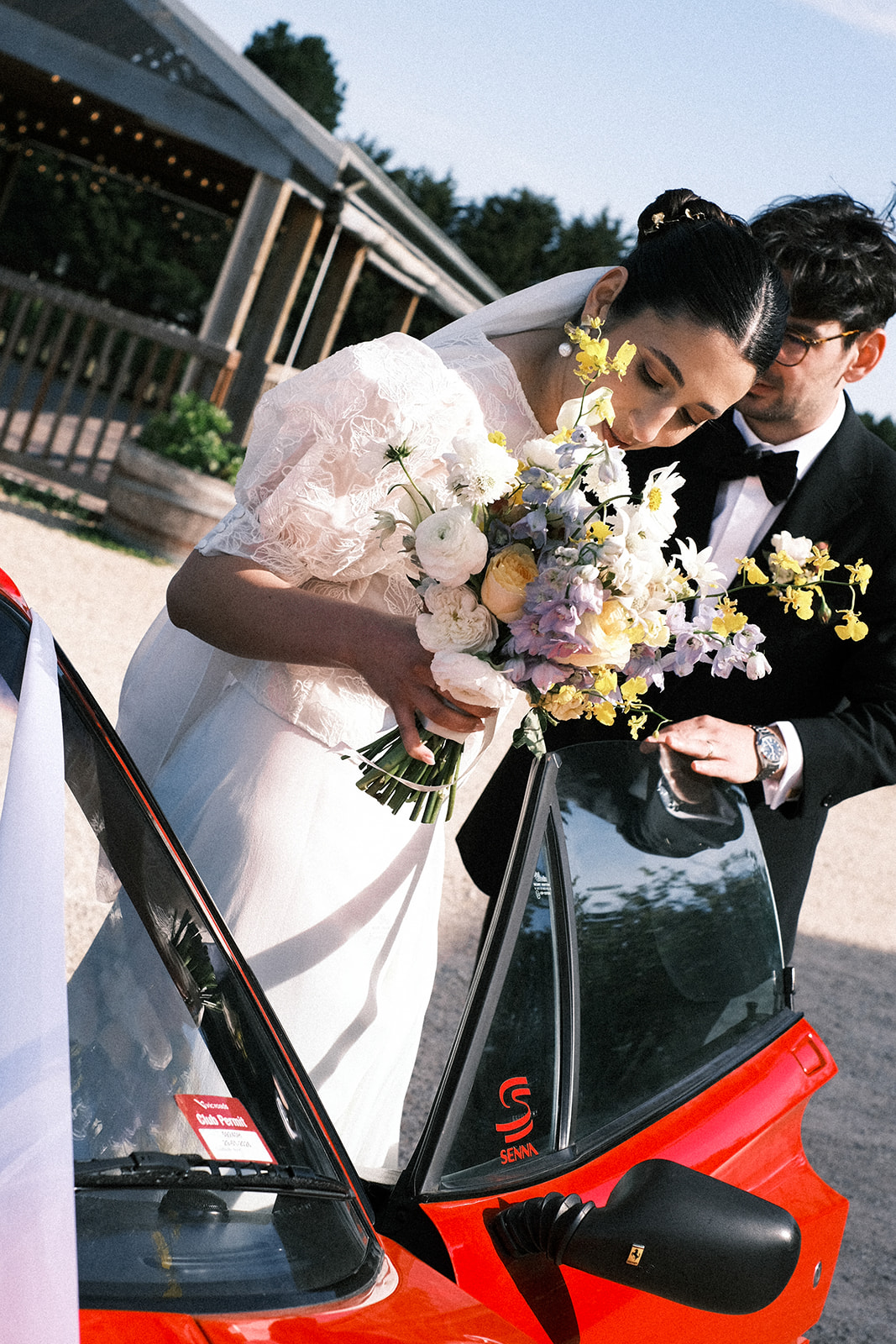 « Nous avons également incorporé une tradition italienne de streamers dans notre première danse », a partagé le duo, tous deux d'origine italienne. D'autres éléments amusants que nous adorons de leur journée ? Il y en a presque trop pour les nommer. Peut-être que le deux-pièces Donatelle Godart Paris de Renée, le livre d'or Off The Hook, la Ferrari (!!) et l'interprétation spontanée de The Knave de Douce Caroline.